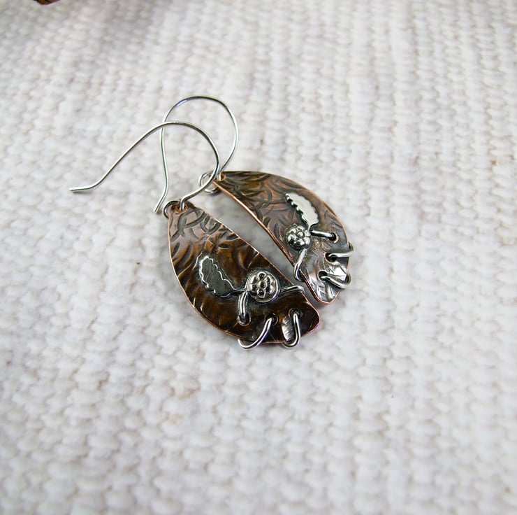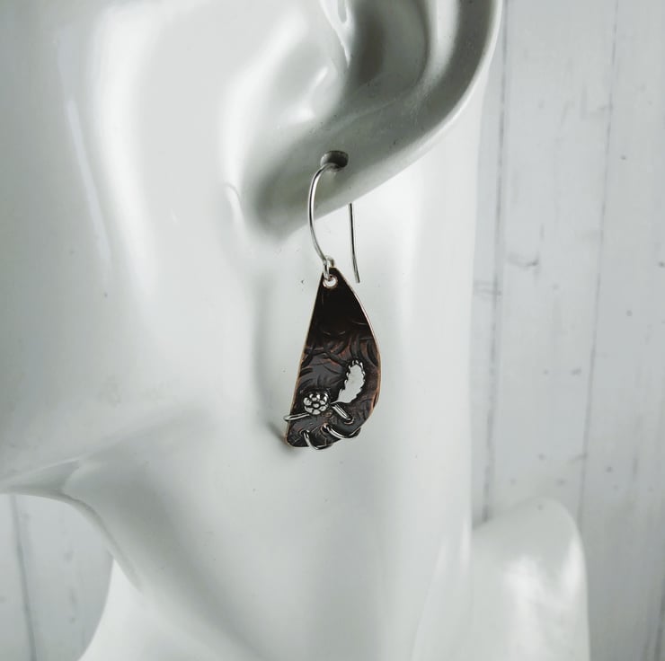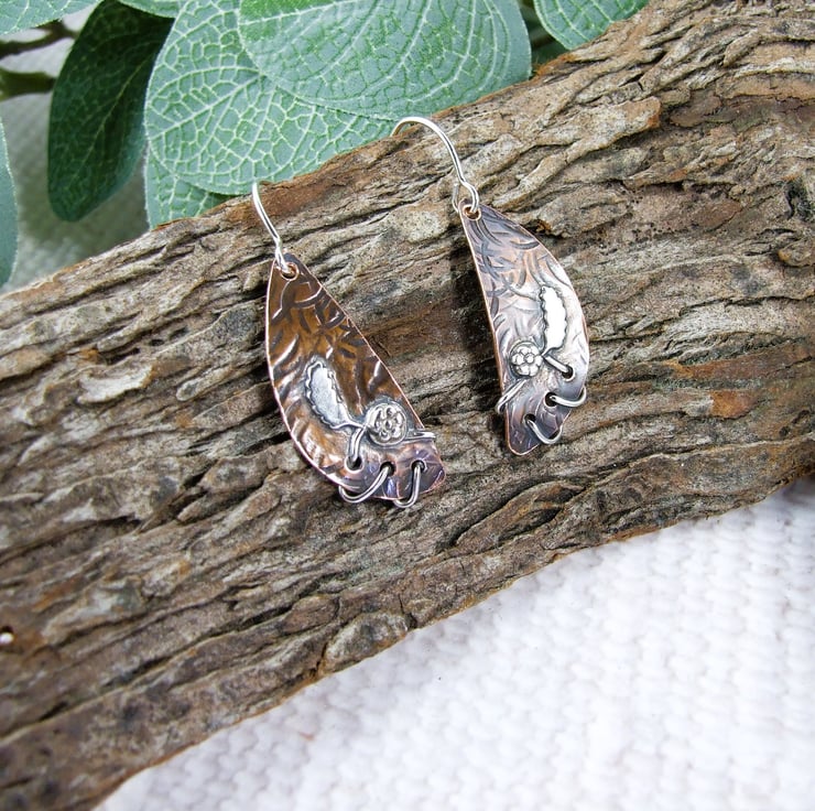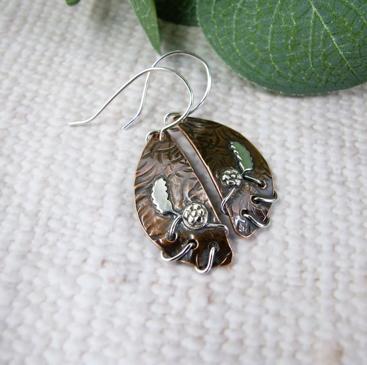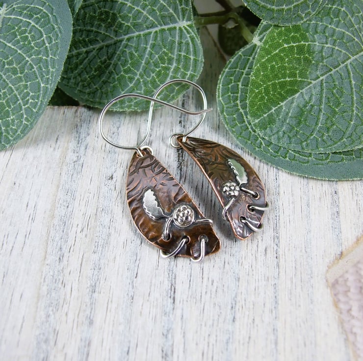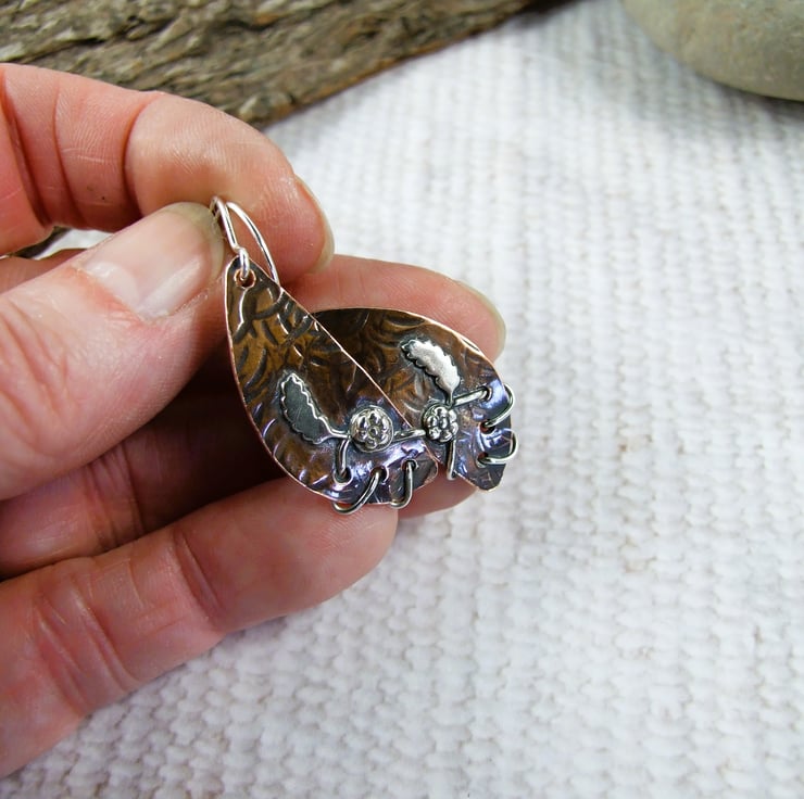 I have created the dropper shapes from copper sheet, hand cut and textured with a hammer. I then created the little flowers with molten silver that I hammered into a steel die and added a little leaf and silver wire wound around to form a vine all soldered securely to the droppers. Fitted to sterling silver ear hooks