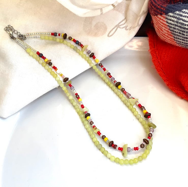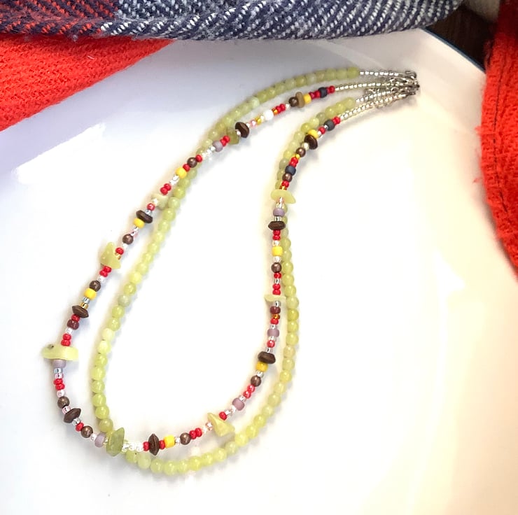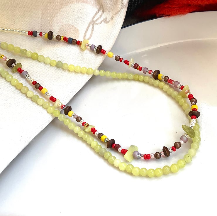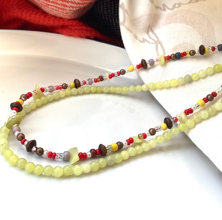 Pretty 2 strand necklace made with yellow Serpentine beads. On the other strand multi colours with gemstone chips, wooden, acrylic and metal beads. Earthy, summery, beach wear necklace. 45-47 cm length. Bright cheerful gemstone necklace