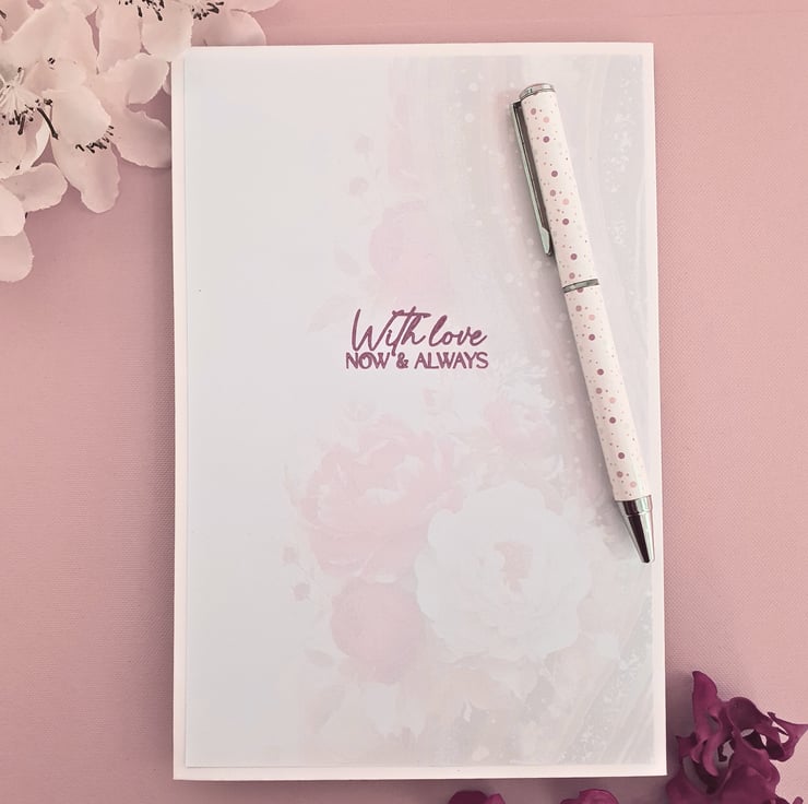 Handmade foldback birthday card for her, displaying red & white peony flowers. The stamped sentiment "With Love Now & Always" makes it ideal for celebrating your wife's, partner's, or girlfriend's birthday!