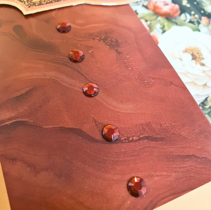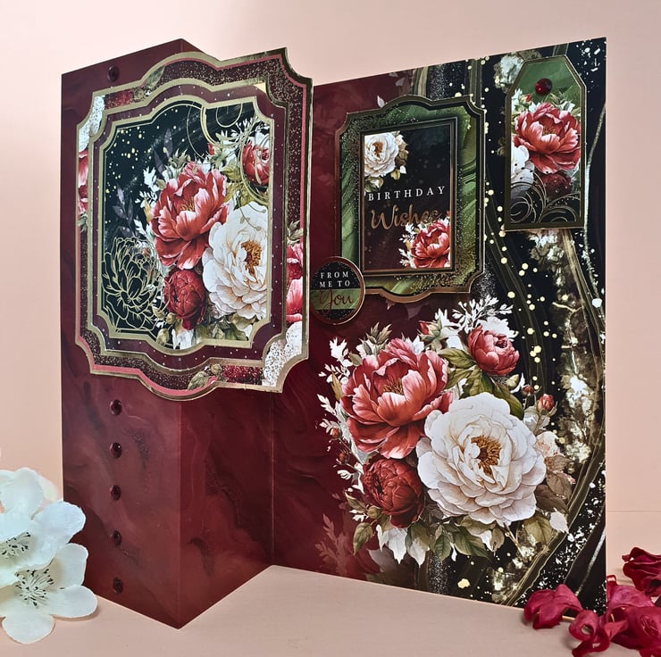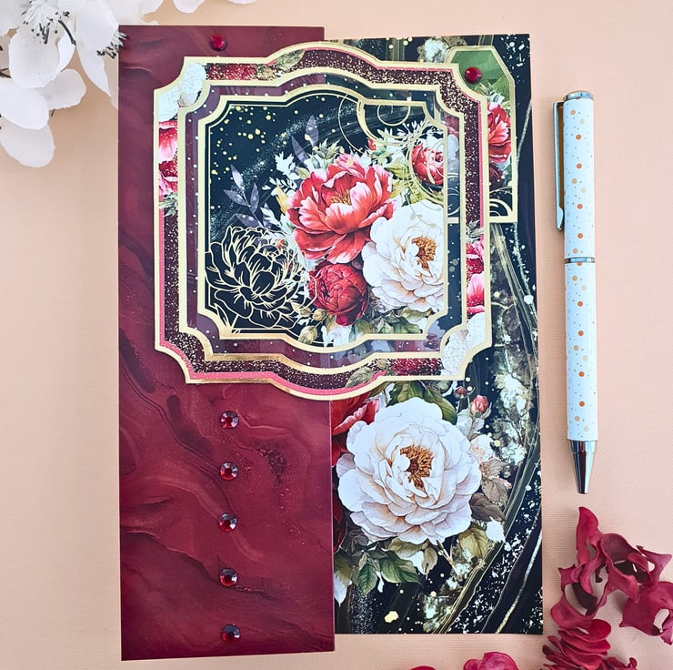 It consists of a luxury cardstock in dark red - brick red tones, printed with a marble effect pattern and a decorative floral corner. A large gold foiled topper displaying a bunch of red & white peony flowers sits on a dotty acetate panel, and decorates the front of the card. A line of red gemstones runs through the left panel. Inside, matching toppers and tags complete the card with the sentiments "From Me To You" & "Birthday Wishes". Finished with a matching insert at the back, that has been stamped with the message "With Love Now & Always" in red.
