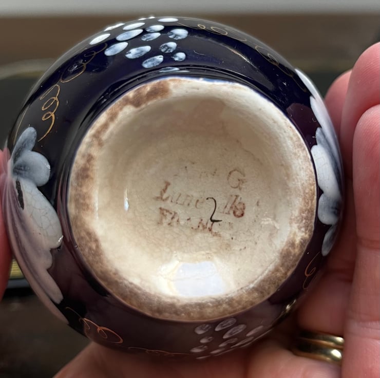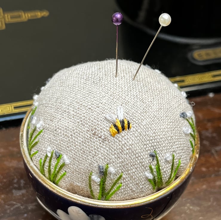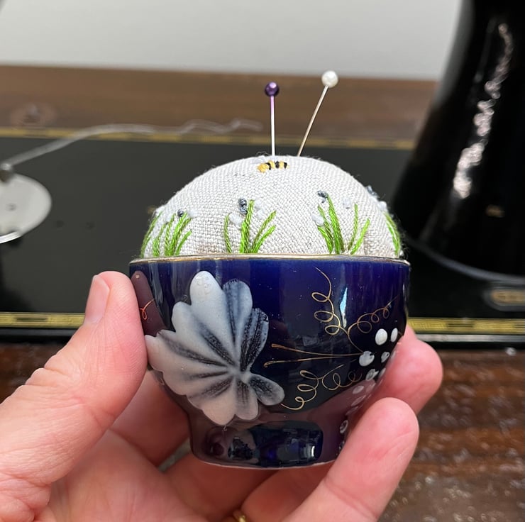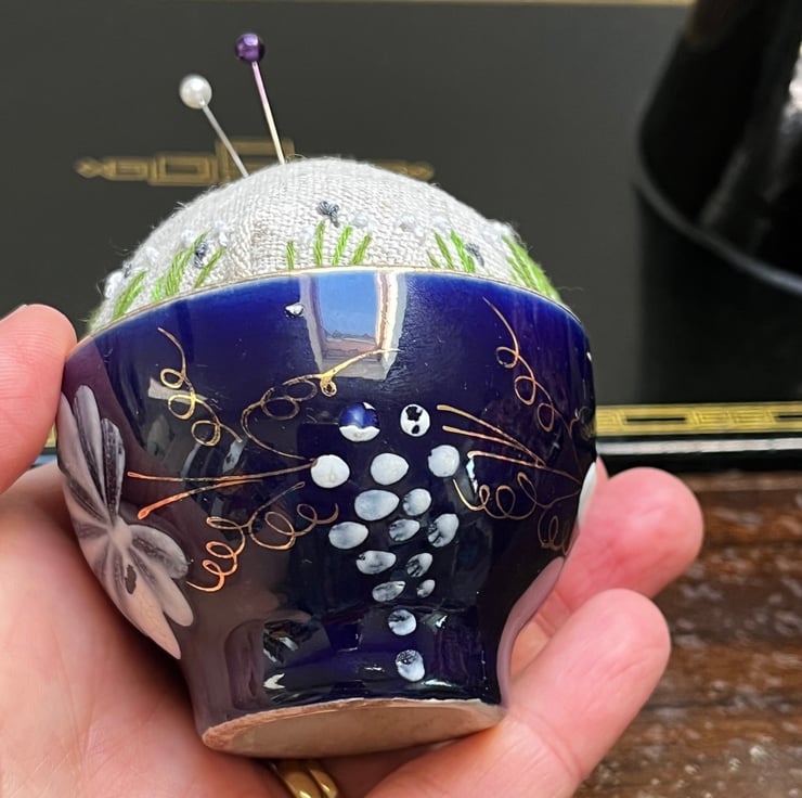 Cute embroidered pincushion in a vintage French bowl with a glossy deep blue surface with white and gold hand painted flowers. The reclaimed linen cushion has been embroidered with tiny flowers and a bee.