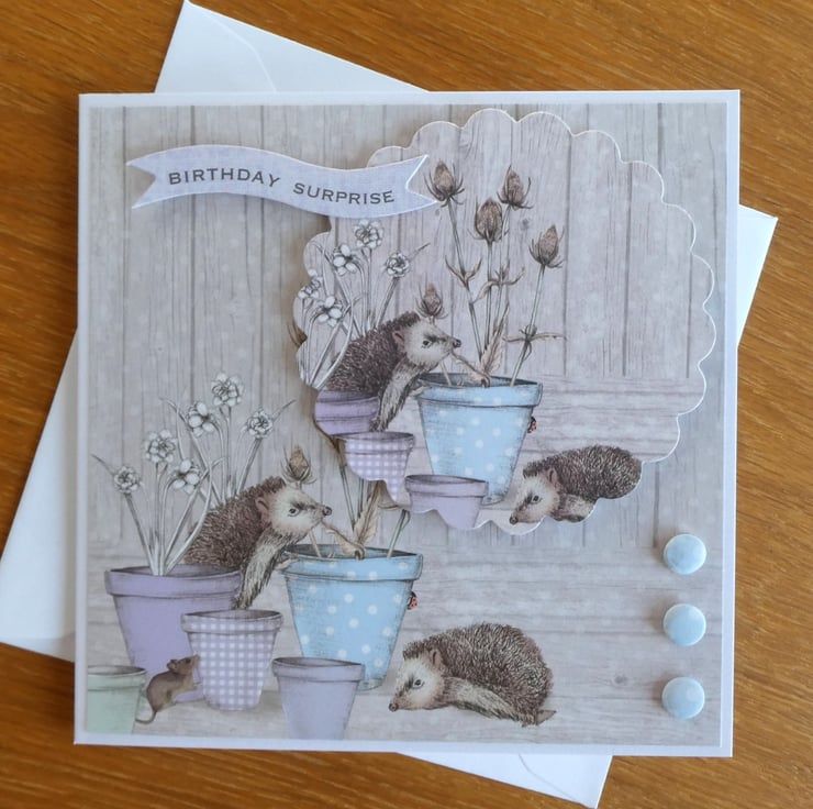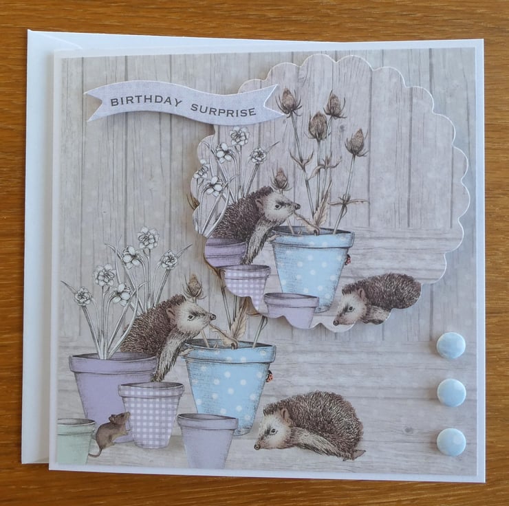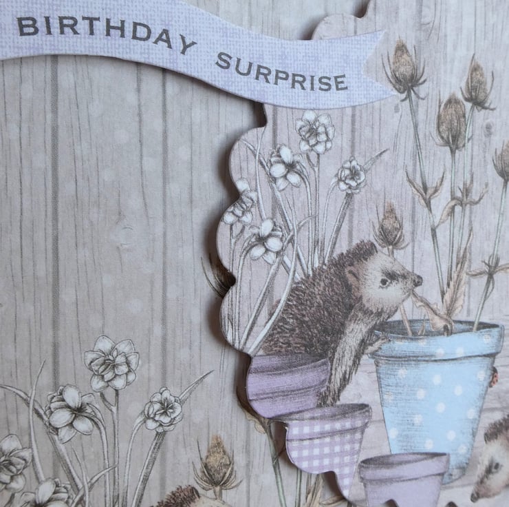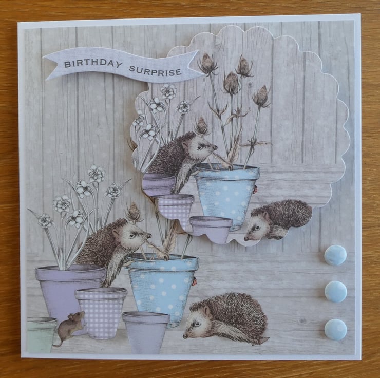 This card has a background paper with a wood effect design and an image of hedgehogs and a mouse investigating plant pots in pastel shades of blue and lilac.