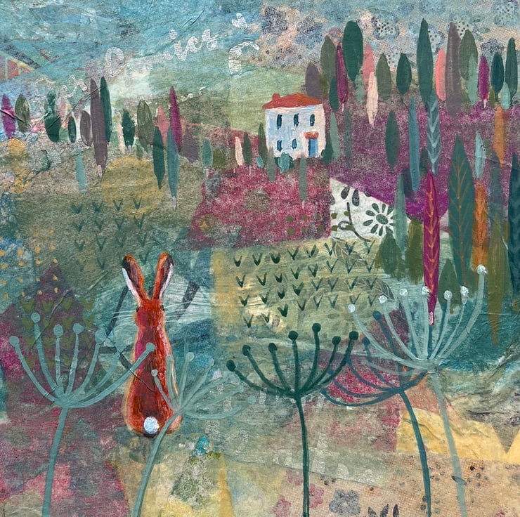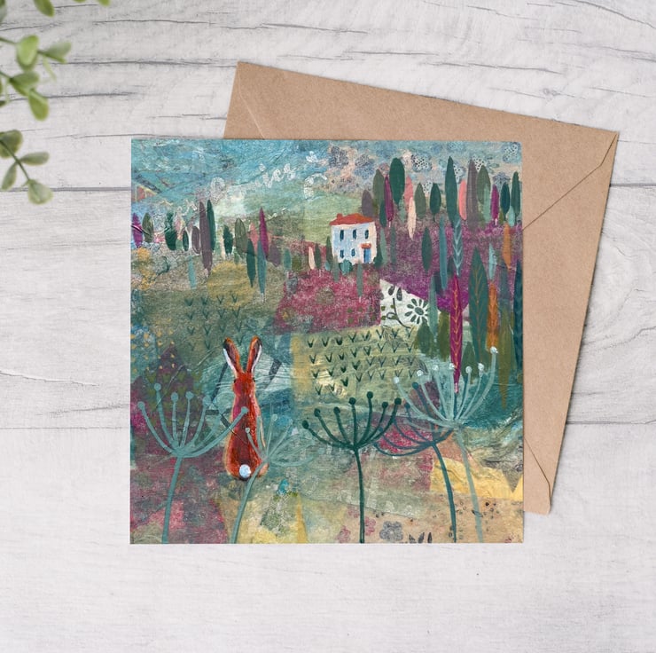 This blank card is printed from my whimsical mixed media painting 'Misty Morning' featuring a hare and a Mediterranean landscape.