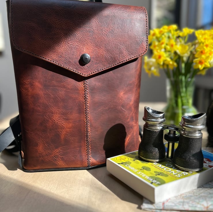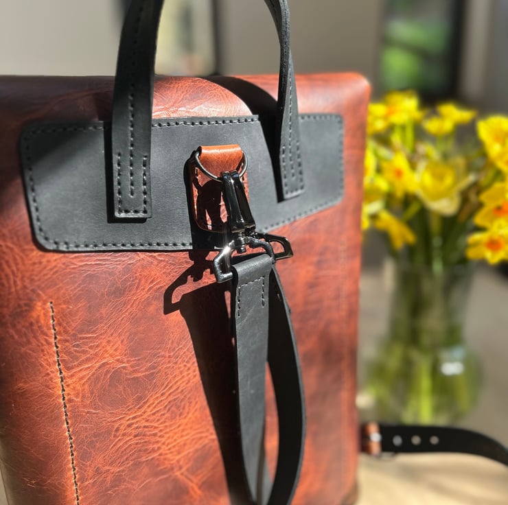 Sewn with traditional saddle stitch using Ritza Tiger waxed thread in a glossy black. The bag is unlined so you see the natural underside of the leather, it's secured with a loxx closure which will not open unless the cap of the upper part is lifted and the ball head is released.