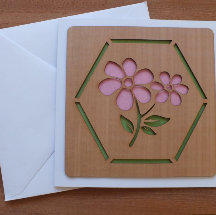 Unique designs are cut out of the wood veneer which is then attached to the card with mounting pads with a coloured paper attached behind which creates a partial 3D effect