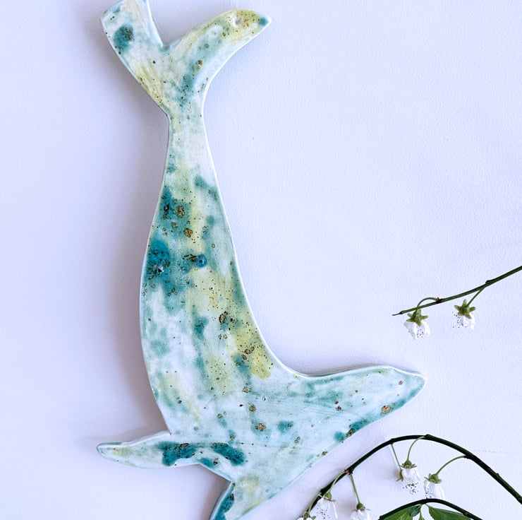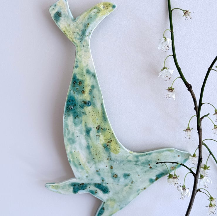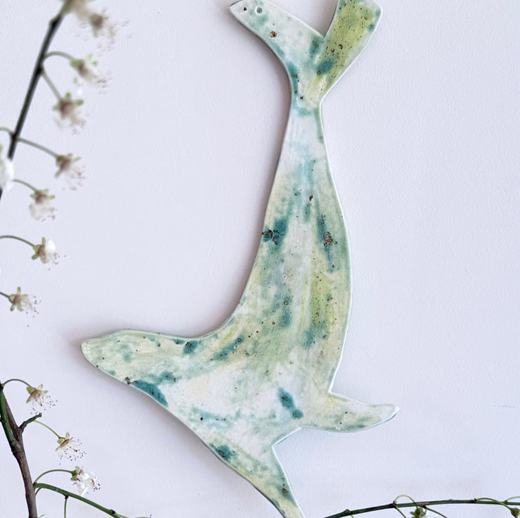 Hand made ceramic hanging seal, painted by hand in shades of green with glazes inspired by the Norfolk coast. This seal measures 24cm- I also have a range of hanging birds, all handpainted with different glazes.