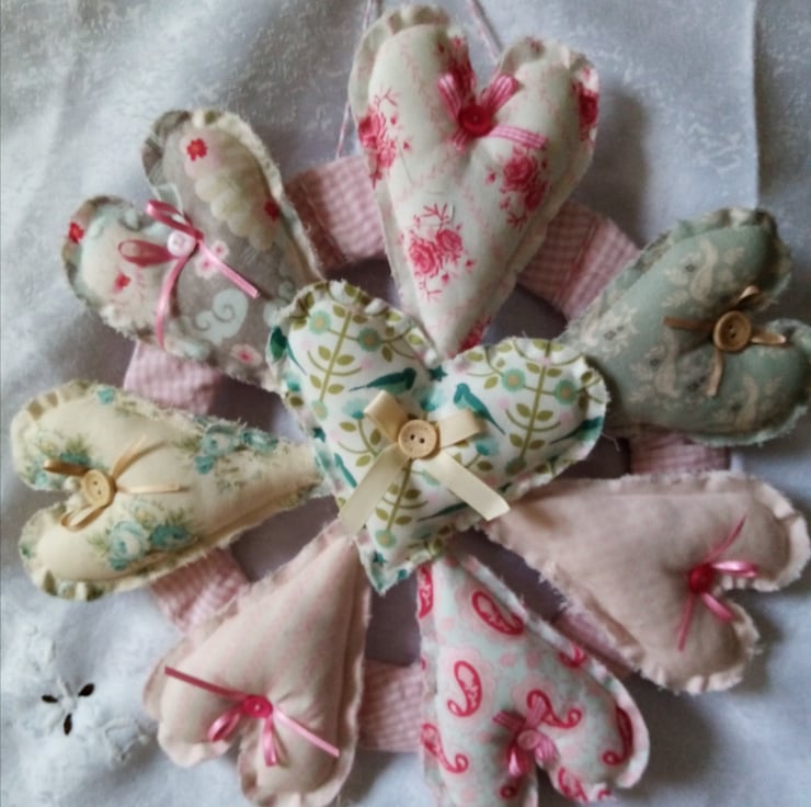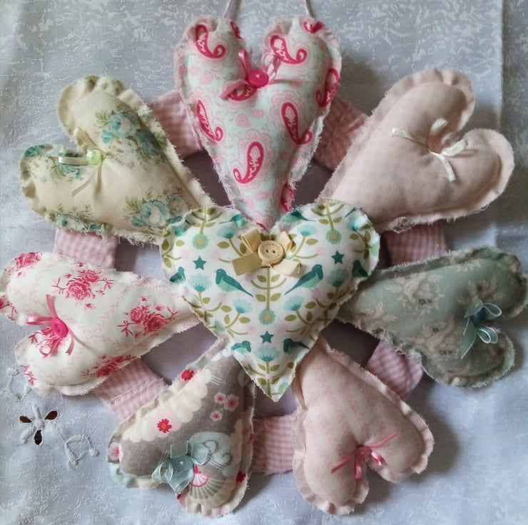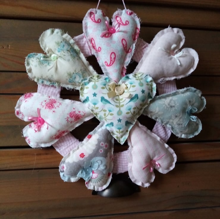 Handmade shabby chic, handmade, one of a kind heart wreath, hearts made in Tilda fabric (rare fabrics from her earlier collections), pastel pinks, blues and creams, pink gingham covered wreath, hearts lightly fraganced with Norfolk Lavender, lovely home decor, Mother's day/ Valentines/anytime gift. Hearts trimmed with button and bow. I have two available, one slightly differs from the other, I have used the same Tilda fabric print hearts on each wreath just set out in a different order around wreath, with slightly different button and bow trims .