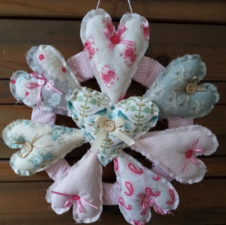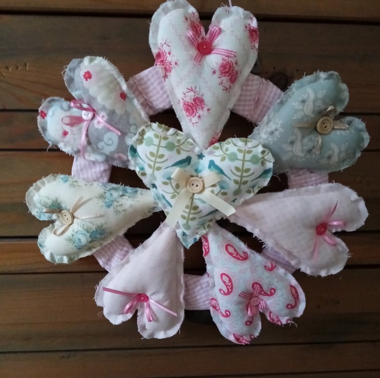 Fabric covered florist wreath, approx 35cm wide, hearts sewn and filled with a little dried Norfolk lavender and polyester fibrefill, button and bow trim glued onto wreath. Bakers twine used to hang.