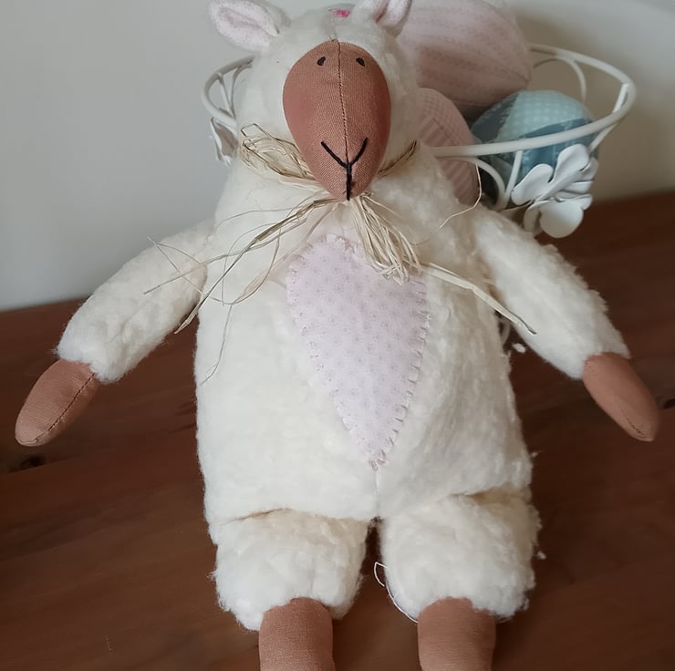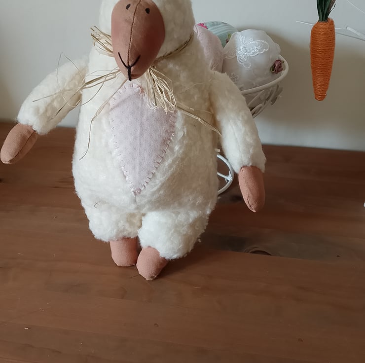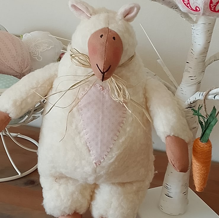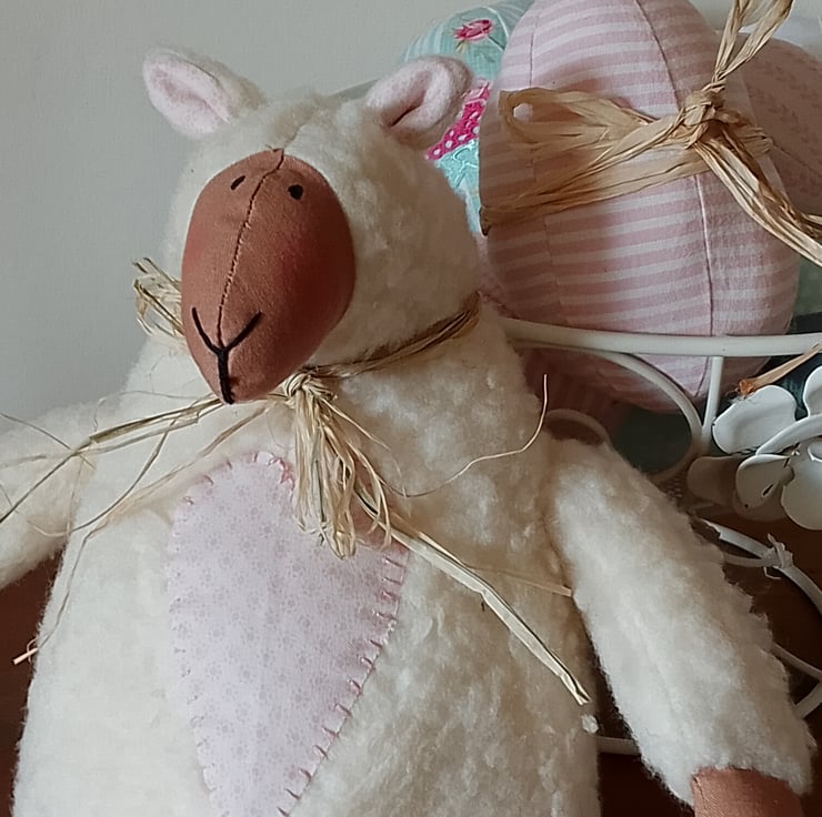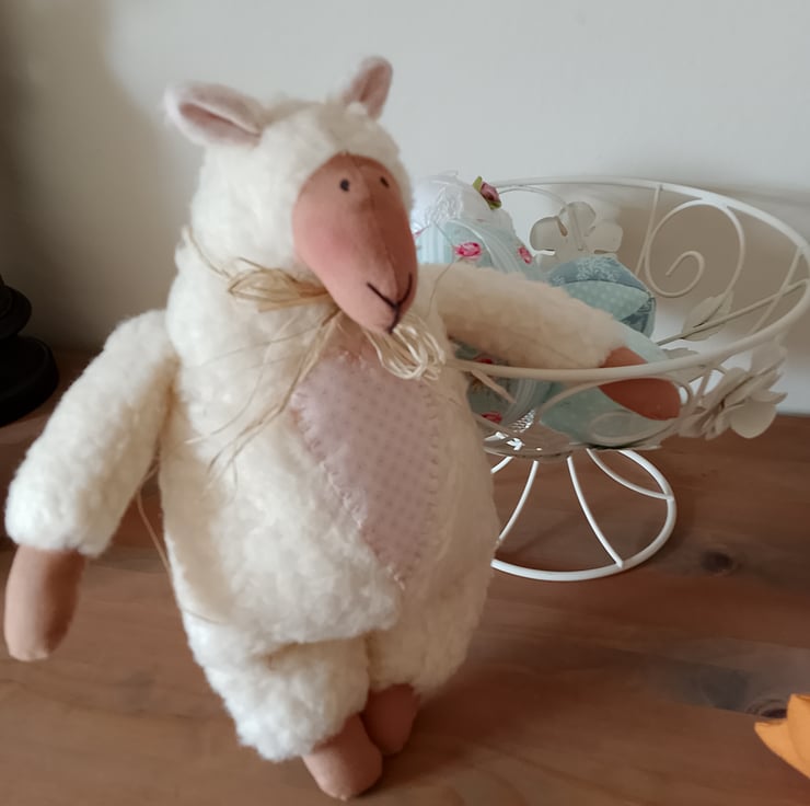 Springtime rustic Tilda style sheep, looking for a home, would make a cute addition to rustic easter springtime decor for the home or a gift. This little sheep is handmade by me from synthetic soft fleece, cotton fabric, natural fibre raffia bow trim and stuffed with a non allergenic polyester fibrefill. Hand painted and hand stitched features. Height of toy is approx 12 inches/30cm.