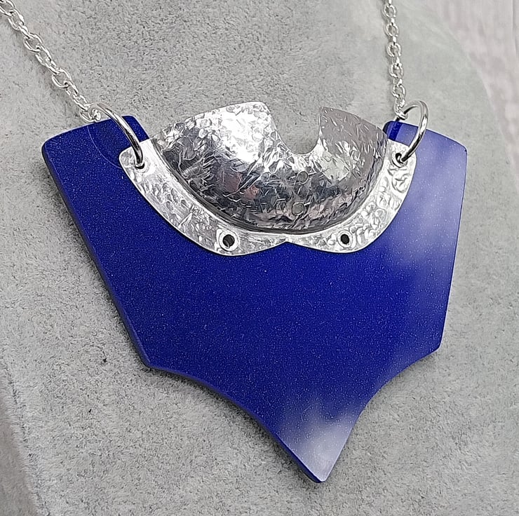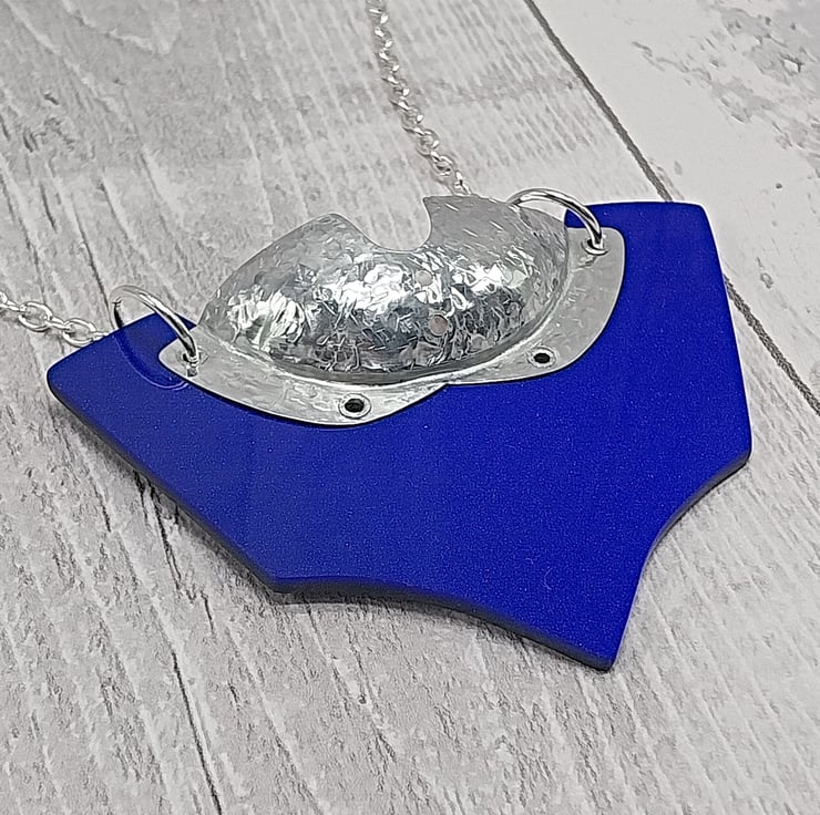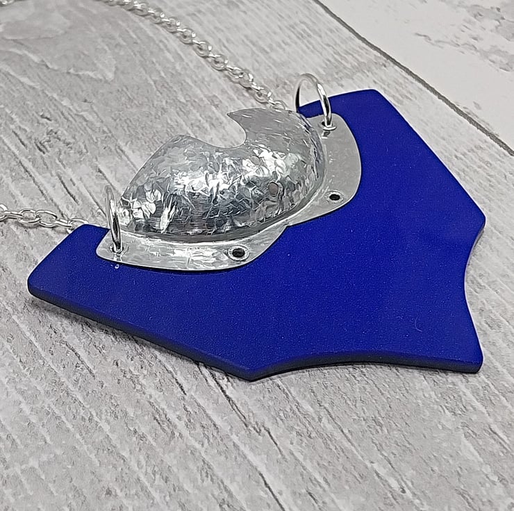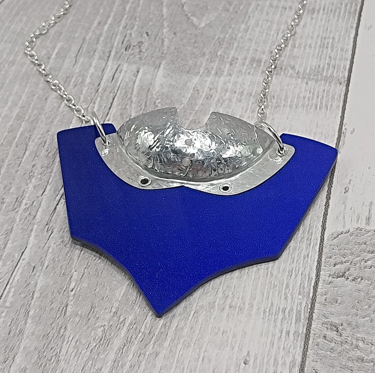 Handmade necklace made from recycled aluminium drink can complemented with the addition of a blue sparkle acrylic shape. The design focuses on the metal base of the can incorporating the domed shape which I have cut, shaped and hammered texture too giving this necklace it’s unique and one-of-a-kind individuality. The acrylic shape made by hand also with a striking bold shape and colour, this is riveted to the metal using aluminium tubing. Eco-friendly material and lightweight and comfortable to wear for all occasions.