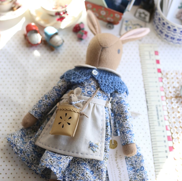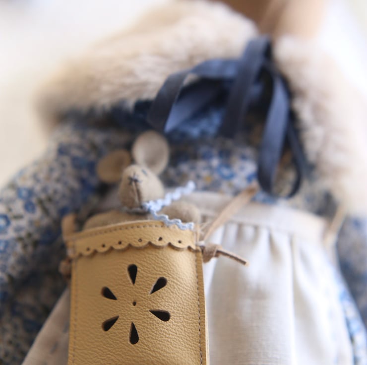 Her accessories include a tiny leather bag, hand punched with a daisy design and containing a baby bunny with a ric rac tie.