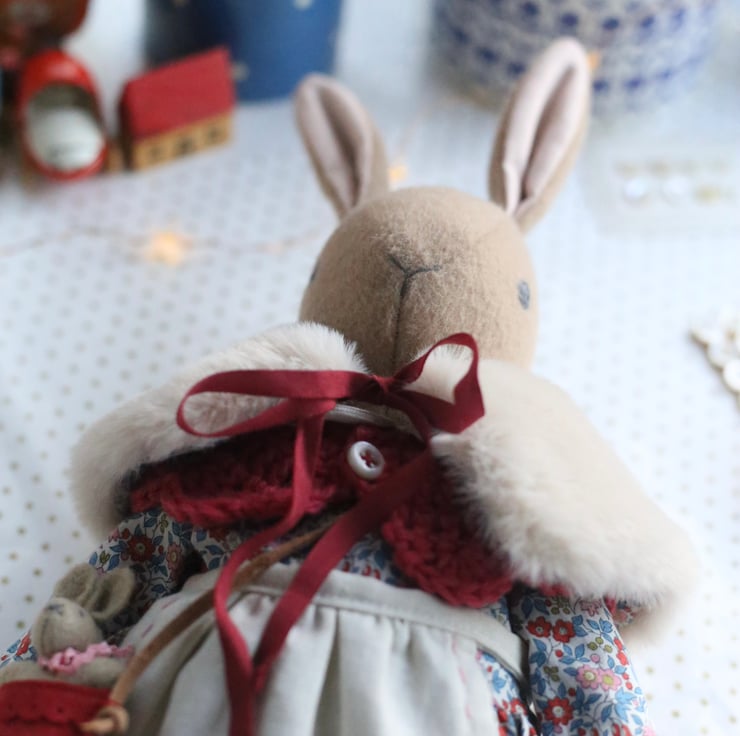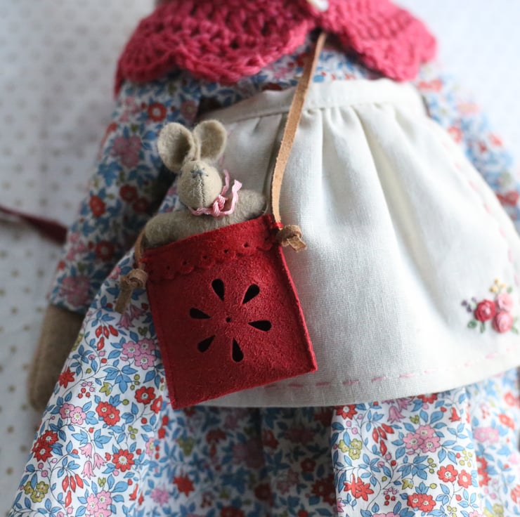 Her accessories include a tiny leather bag, hand punched with a daisy design and containing a baby bunny with a ric rac tie.