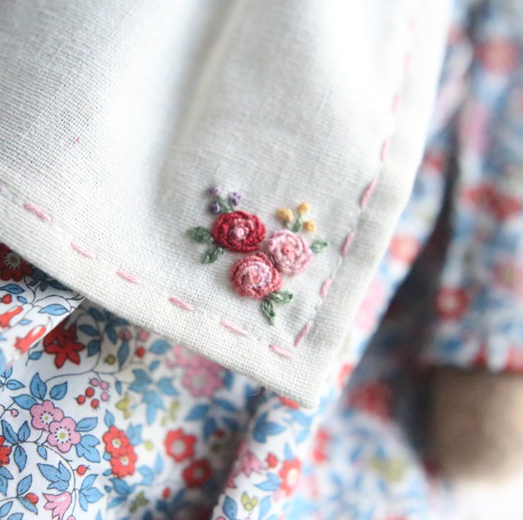 Her apron is made from cotton/linen fabric and embroidered with tiny running stitches and a little sprig of flowers.