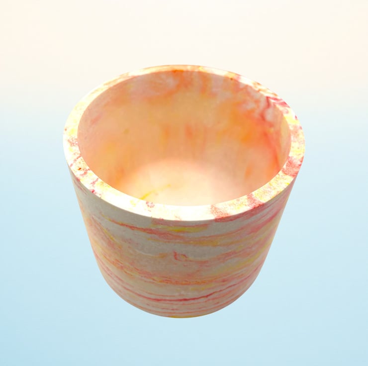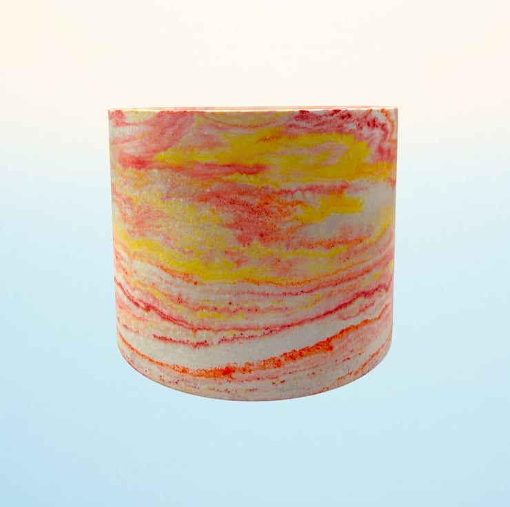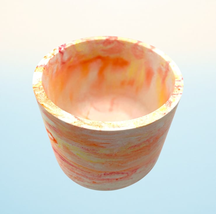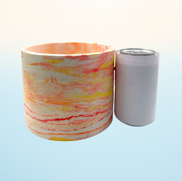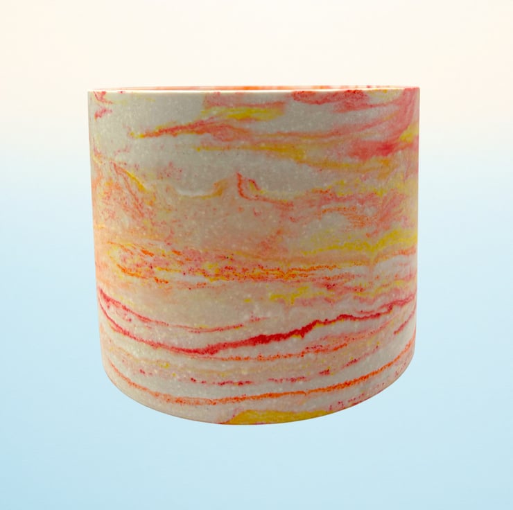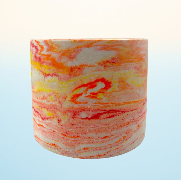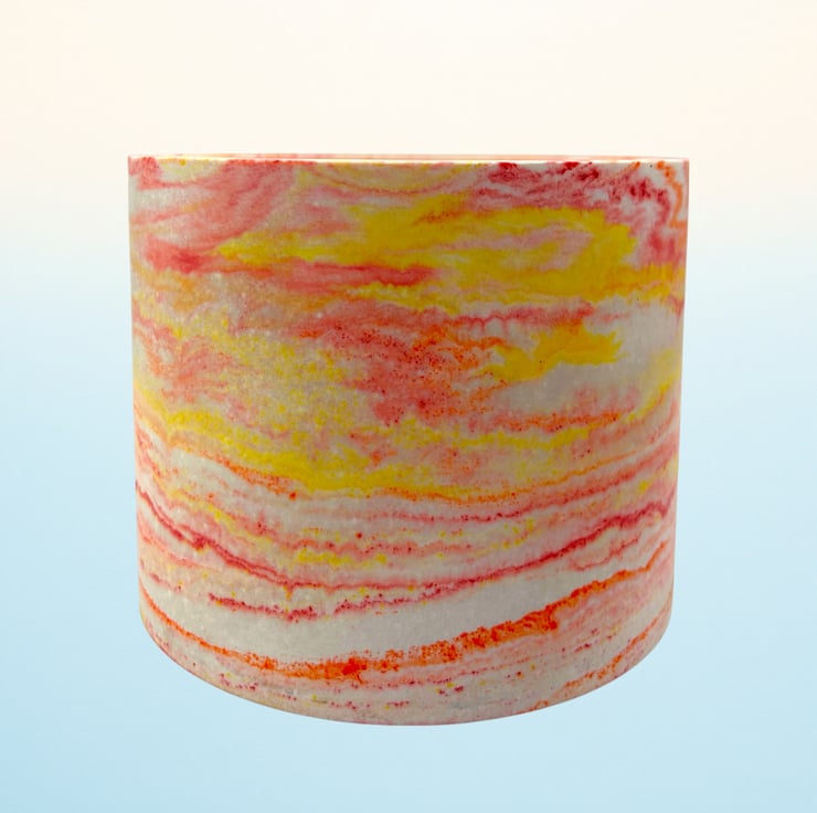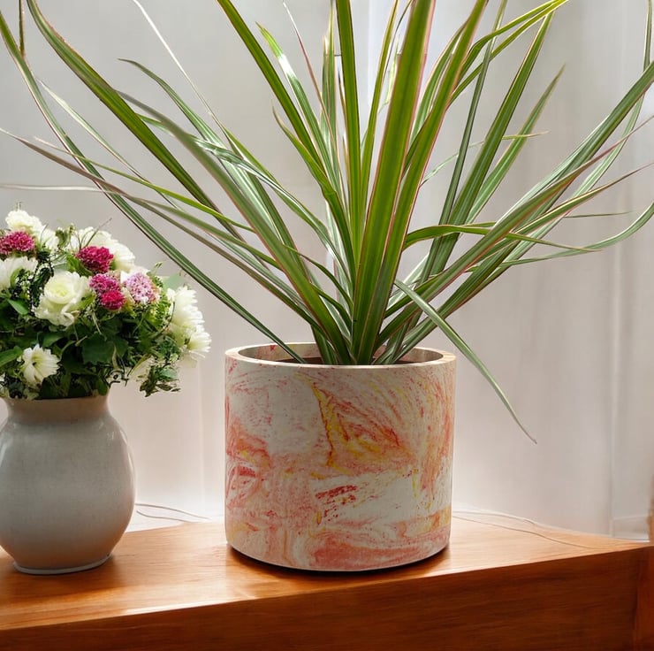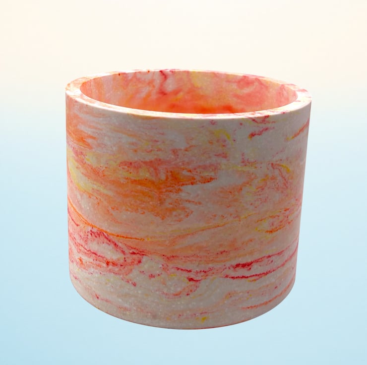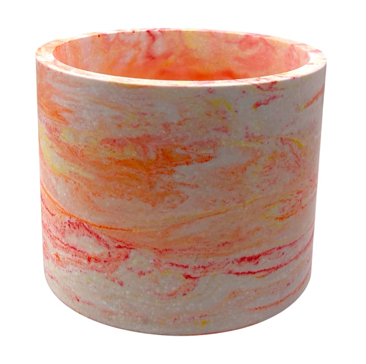 This handmade large round plant pot showcases a captivating red, orange, and yellow marbled pattern reminiscent of a stunning sunrise. Inspired by nature’s beauty, the unique design is a testament to the artistry and creativity that goes into each pot. Crafted from premium alpha plaster called Cassini’s, a material commonly used in stone and marble restoration and repair work, this pot holder boasts a smooth, luxurious finish similar to marble, making it water- and weather-resistant.
