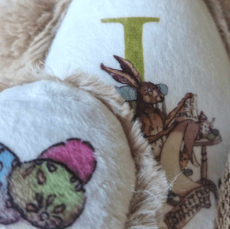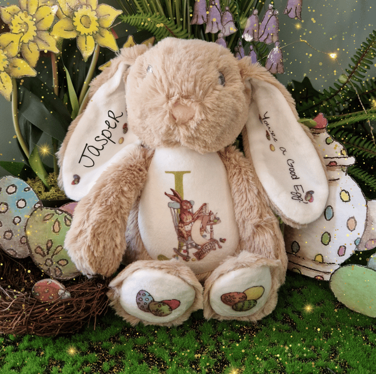 Hand printed with care, the hare’s tummy features my exclusive illustration of the Easter Hare in a rocking chair, checking the Good and Bad Egg list, with a polka-dot egg teapot by the side, and your chosen initial for a personal touch. The paws feature Easter egg elements, also from my original illustration. One ear can be personalised with a name, while the other carries the message “You’re A Good Egg!” surrounded by delicate Easter egg designs.