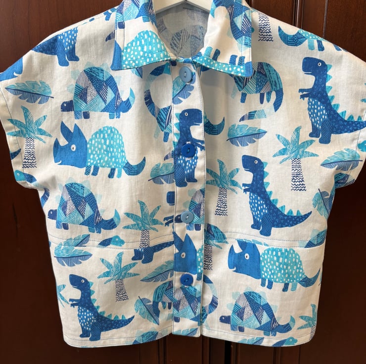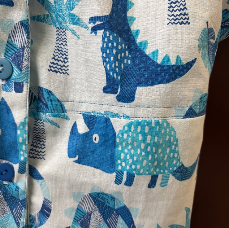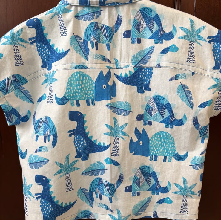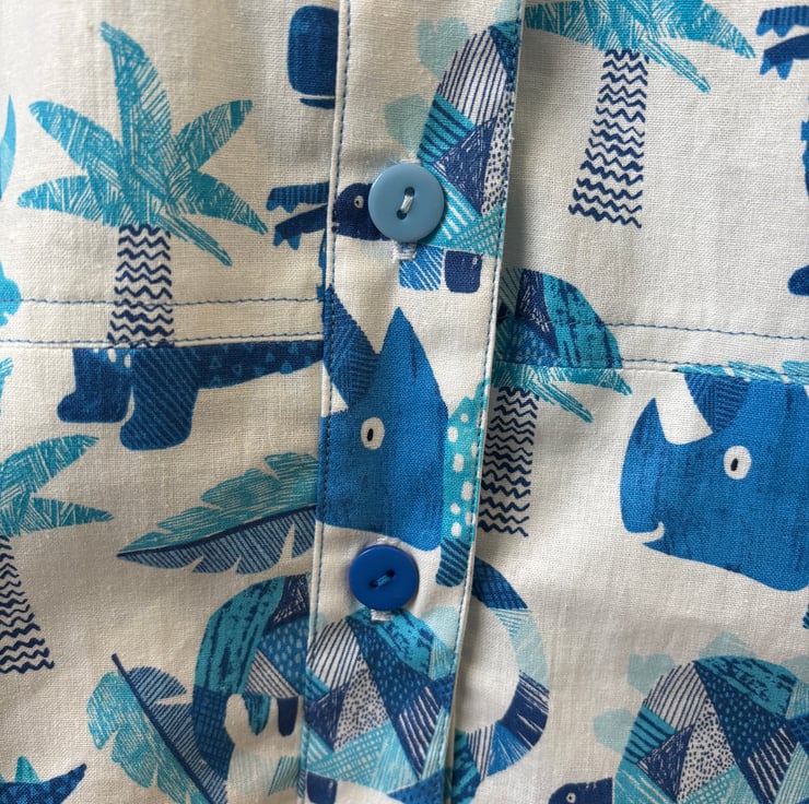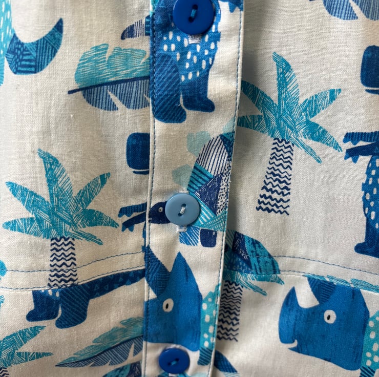 Shirt closed with buttonholes and buttons in two shades of blue in keeping with the print.