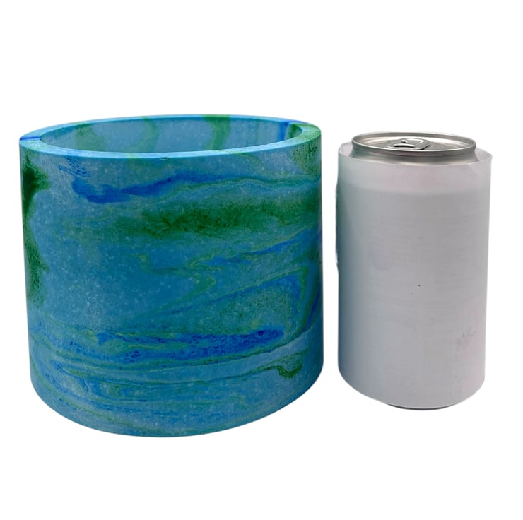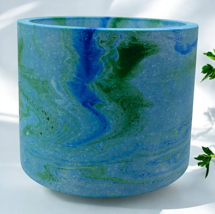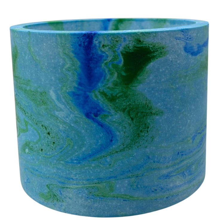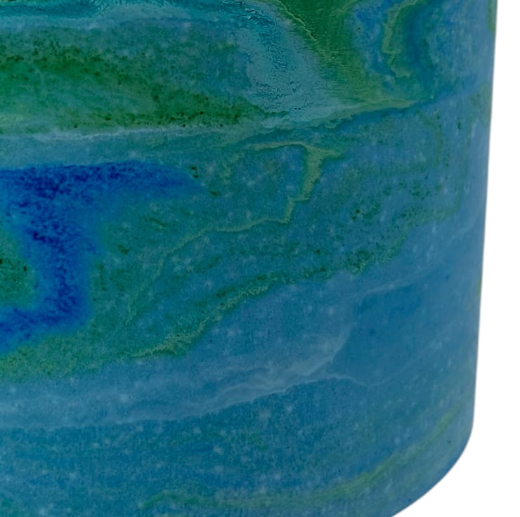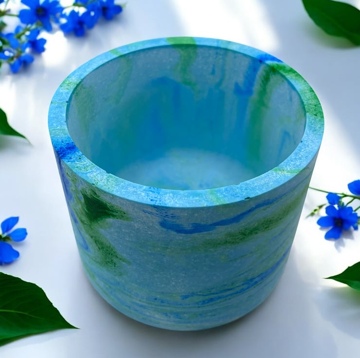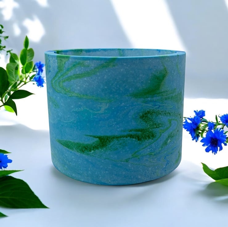 This handmade blue plant pot features blue and green marbling inspired by the colours of the sea. I used different shades of blue and green to create the seascape effect that swirls around the pot and then added a small amount of green glitter pigment to give it a few subtle shimmery patches. The beautiful marbling effect makes each pot a unique piece of art, making it an ideal gift for a special person or a lovely treat for yourself.