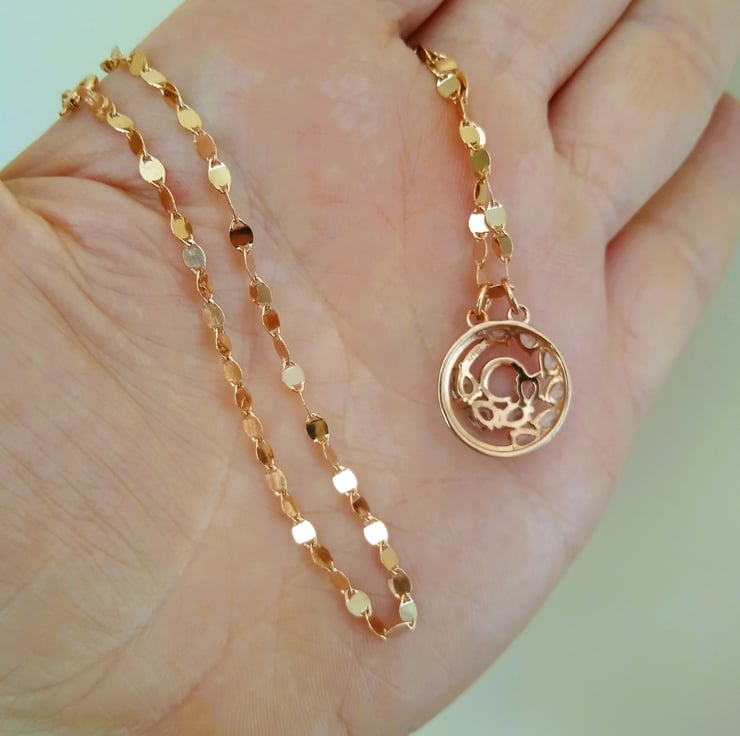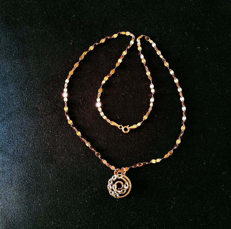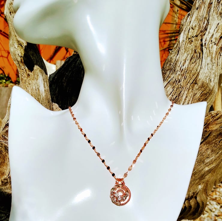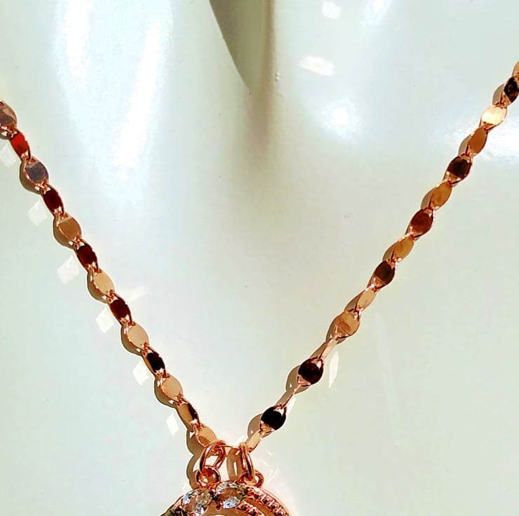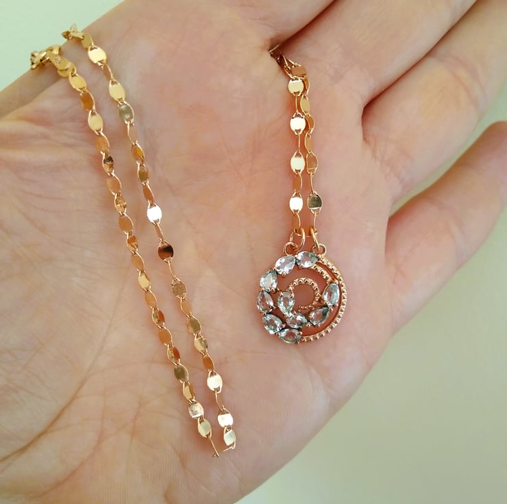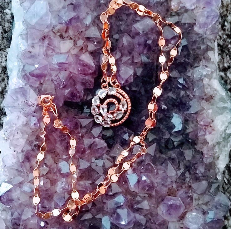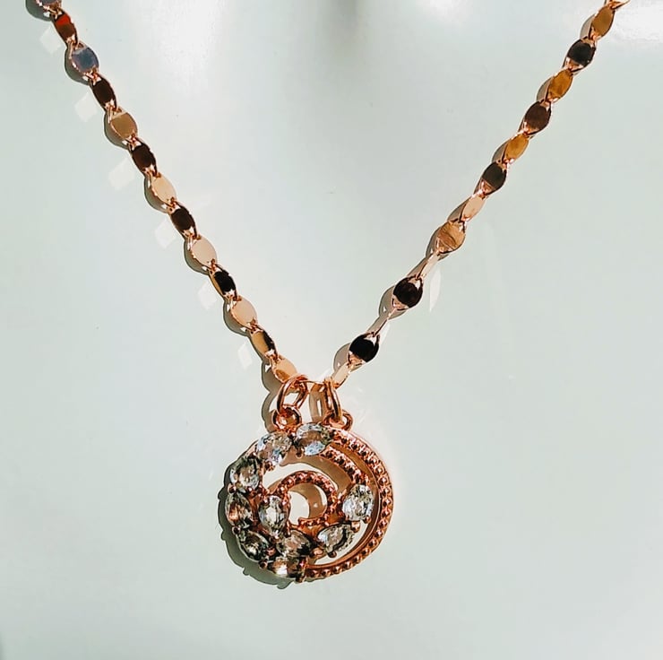 Glisten in the sunlight with this highly reflective rosegold on sterling silver flat oval mirror chain link necklace of 18 inches in length. With a circular spiral pendant spattered with ten dazzling natural pave set white Topaz gemstones for added sparkle. Each stunning topaz gemstone is 4x3 mm in size.