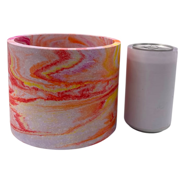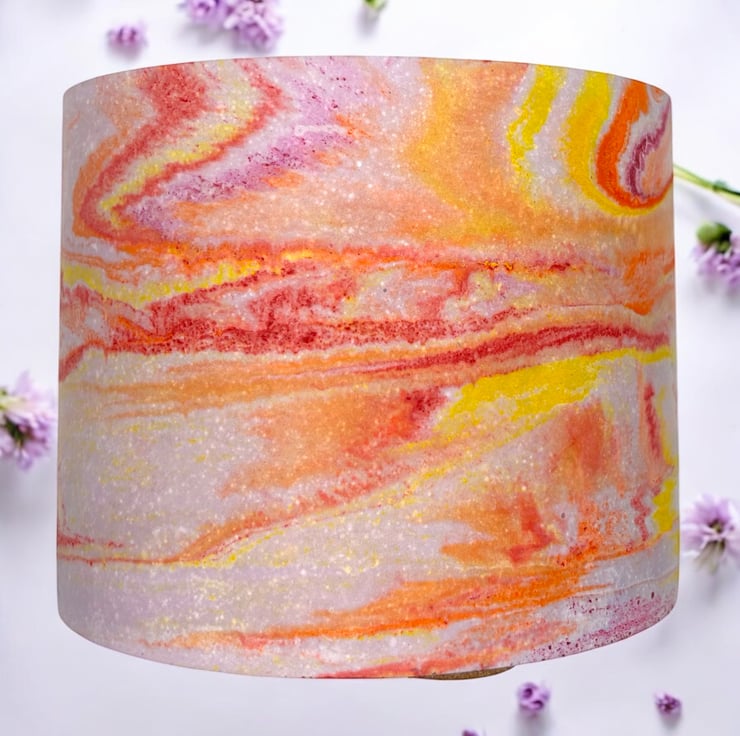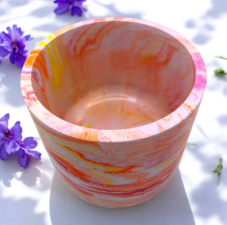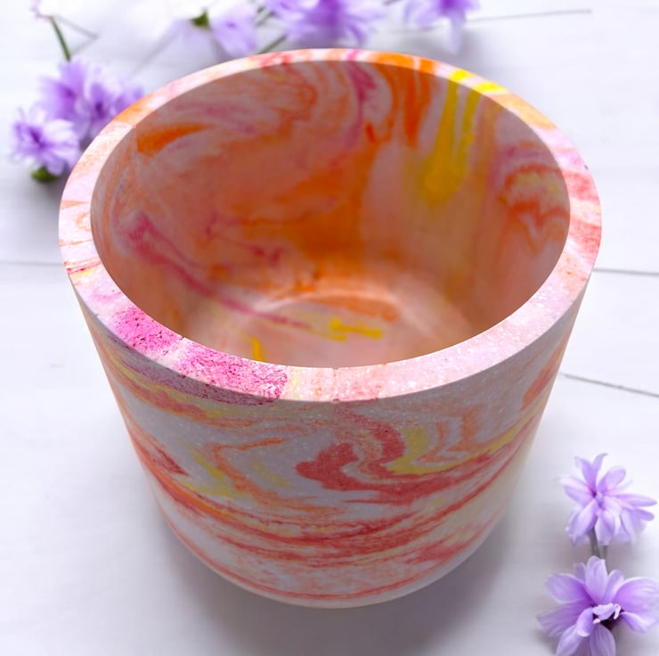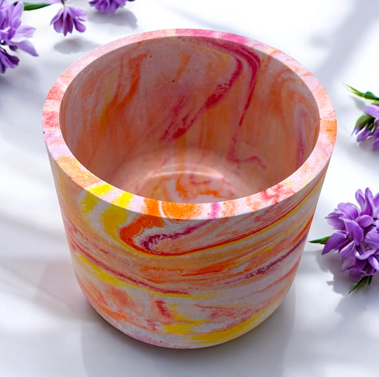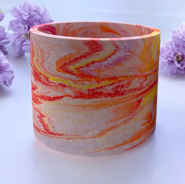 I was inspired by the beauty of a sunrise, to create this handmade plant pot. It features a unique marbling pattern in yellow, orange, and red against a lilac background. The beautiful marbling effect makes each pot a unique piece of art, making it an ideal gift for a special person or a lovely treat for yourself.