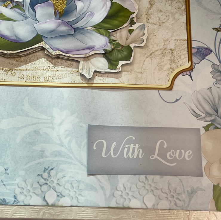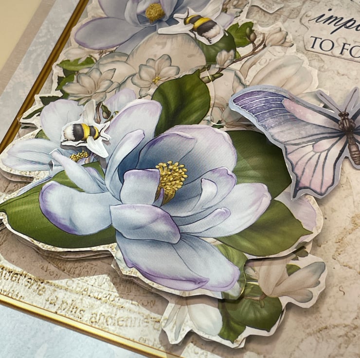 A beautiful and feminine with love card. This A5 sized card features a lovely magnolia and butterfly layered design. The background is a soft blue with magnolia flowers and foliage twining up the side. The main image is a decoupaged floral design with magnolias in the palest of blue. This is enhanced with bumble bees and butterflies. The greeting says Good friends are hard to find, harder to leave and impossible to forget. There is also a With love greeting. A lovely card to send to a friend for a birthday or just to say how much you appreciate them.