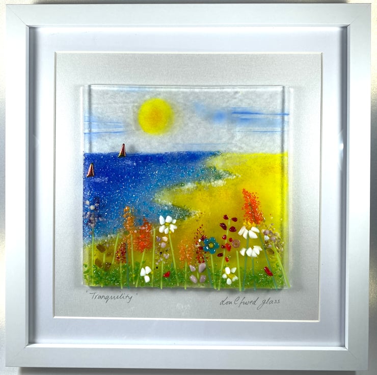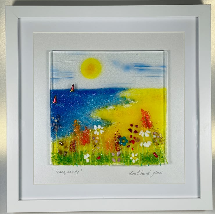 Gorgeous vibrant fused glass picture “tranquility “ created to encapsulate that feeling of tranquility when you enter a deserted beach on a beautifully sunny day . Created entirely from glass with dichroic glass elements . Overall size 24 cm square including frame .