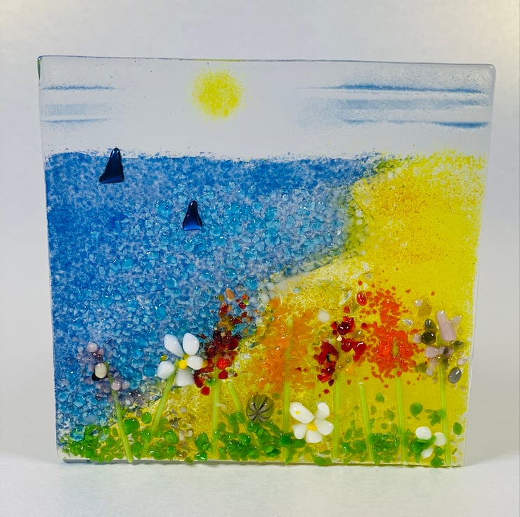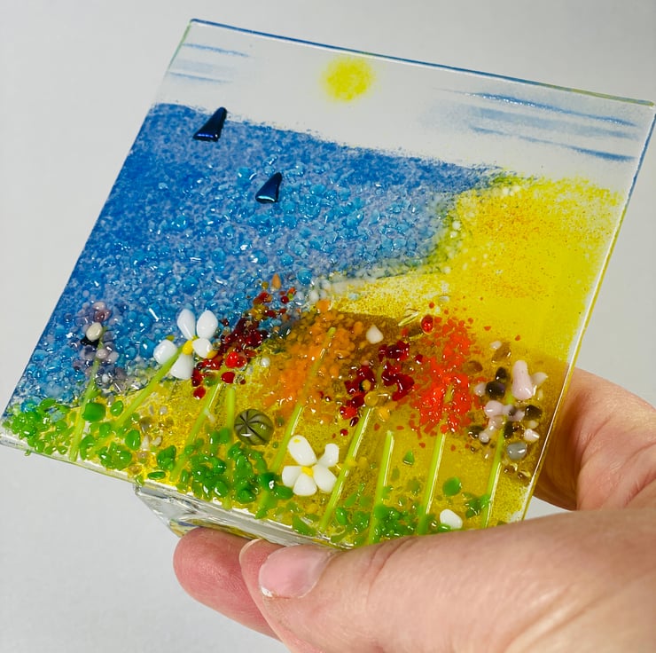 A piece of glass art that also duals as a unique candle holder . The 4 inch square fused glass panel is a beautiful way to add a bit of interest to your shelf’s which by night looks great backlit with a tea light .
