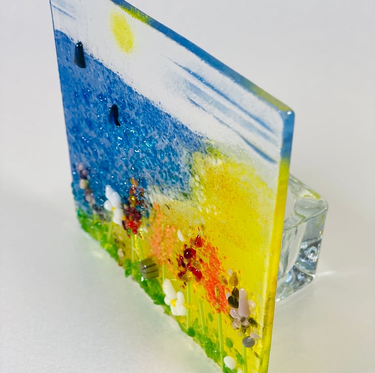 Each panel is created entirely fril glass in my kiln then u v glued to a glass candle holder