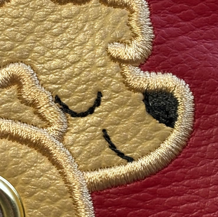 faux leather and has a gold coloured grommet where the poo bags come out. There is also a gold coloured lobster clip to attach to a lead or belt.