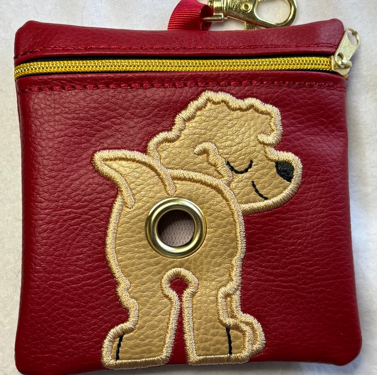 Poo bag dispenser with appliquéd image of a Cavapoo. It is made from matt effect red