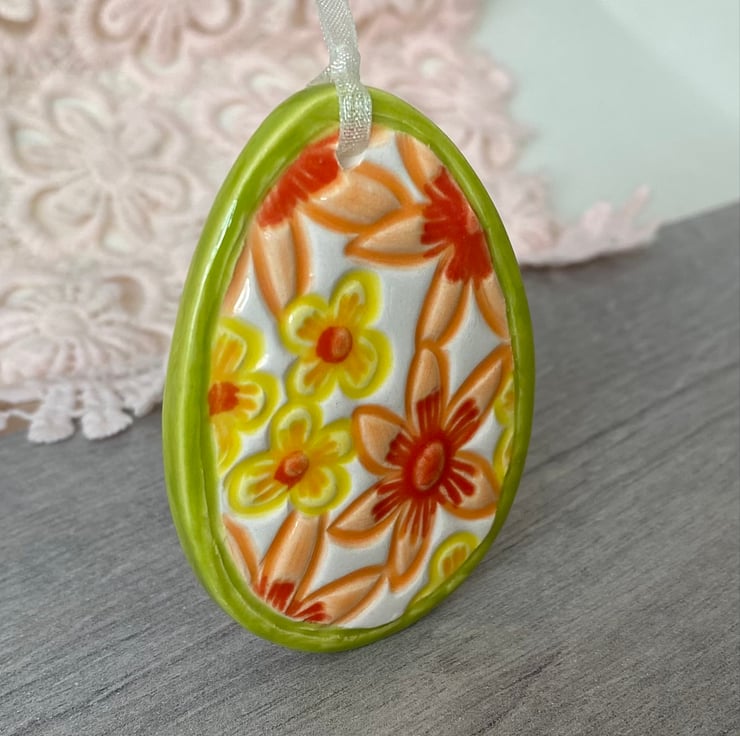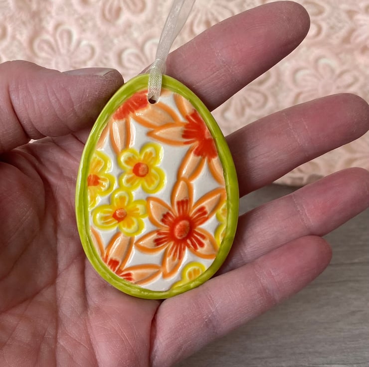 This little ceramic easter egg is made from white earthenware clay and imprinted with a floral pattern. This has been fired in an electric pottery kiln, so it is nice and strong. It measures 6.5cm x 4.5cm and hangs from a matching cream organza ribbon. It is glazed on the front and left plain on the back.