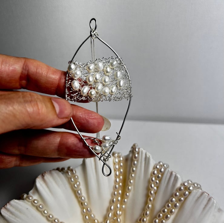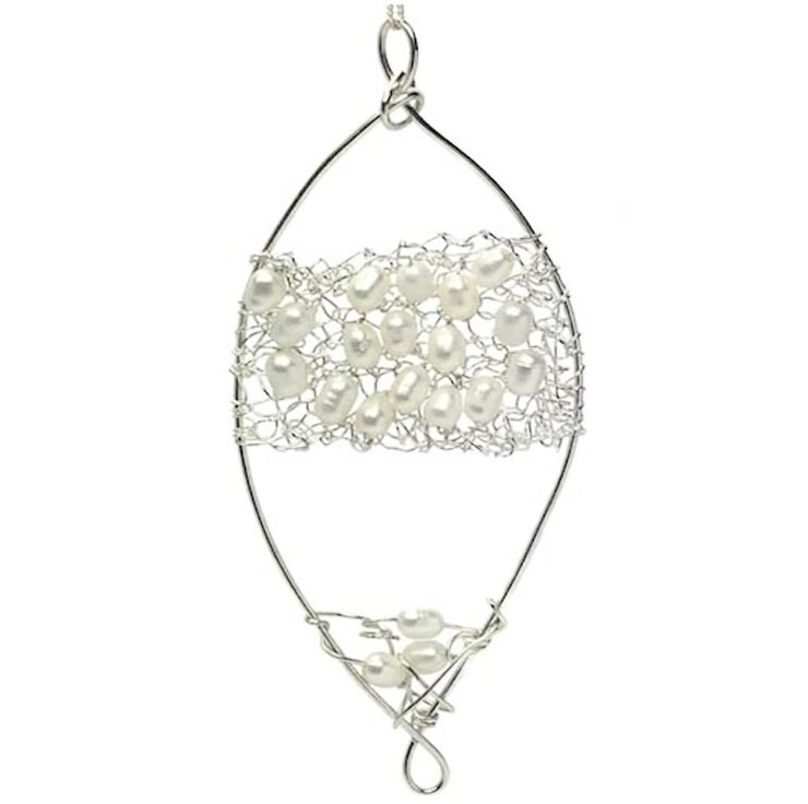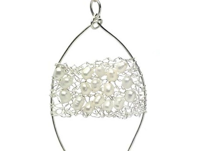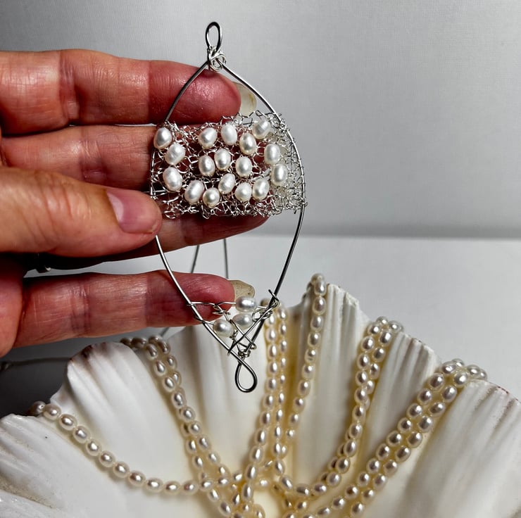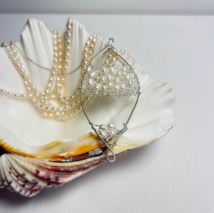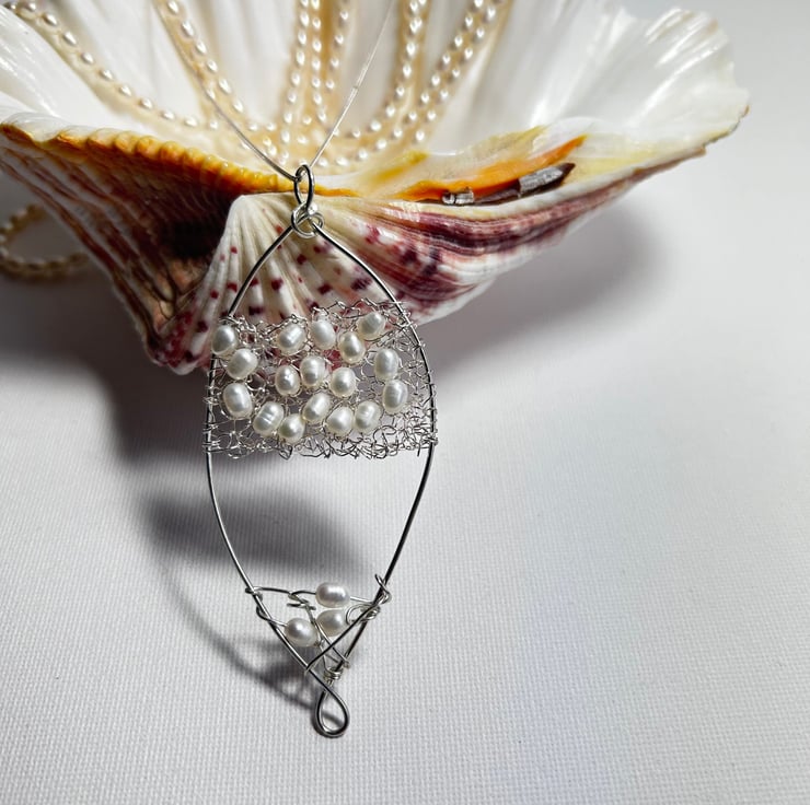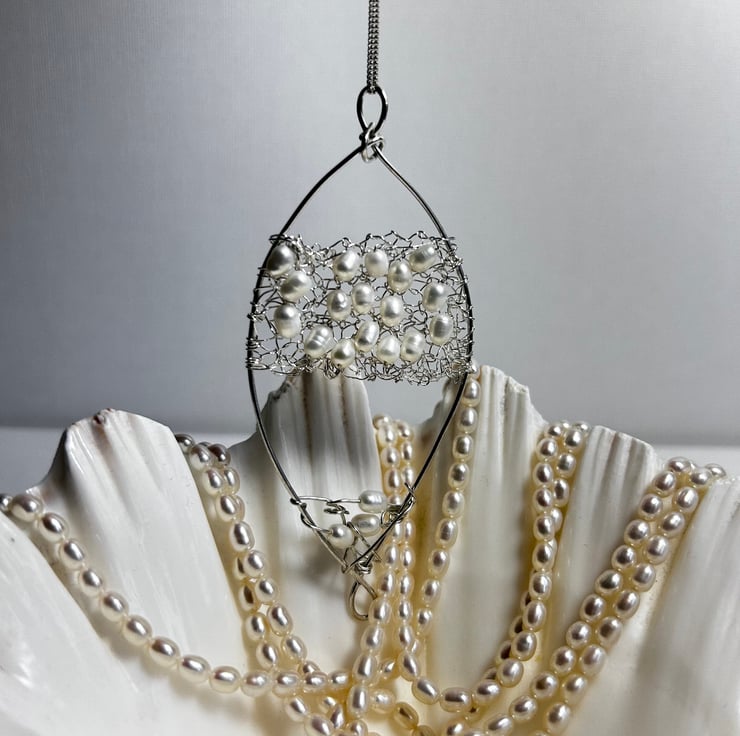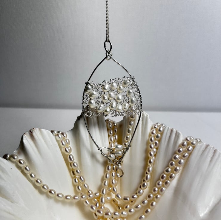 Large Feature pearl and silver Pendant. This was made by knitting Pearls within the silver and sewn onto the framework. Perfect for Weddings. Sterling silver combined with freshwater pearls to create a unique piece of jewellery.