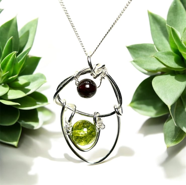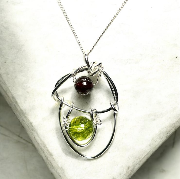 Contemporary Peridot and Garnet pendant unique in style a piece of art jewellery that would be sure to please.
