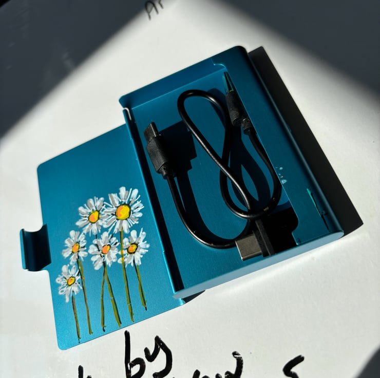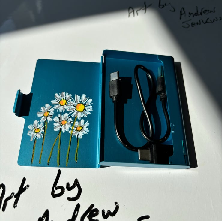 A hand painted and sealed emergency charger cable and adapter by Andrew Jenkins