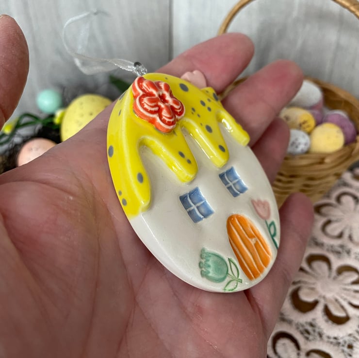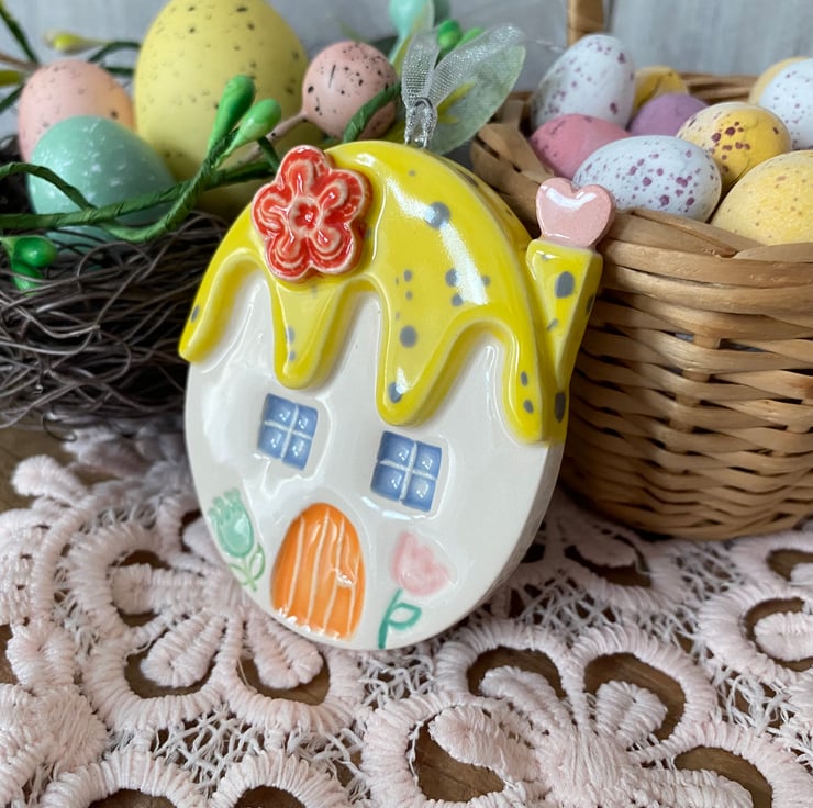 This little ceramic easter egg house is made from white earthenware clay and finished the a flower to the roof and a little pink heart in the chimney. This has been fired in an electric pottery kiln, so it is nice and strong. It measures 7cm x 5cm and hangs from a matching organza ribbon. It is glazed on the front and left plain on the back.