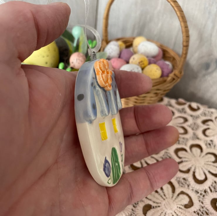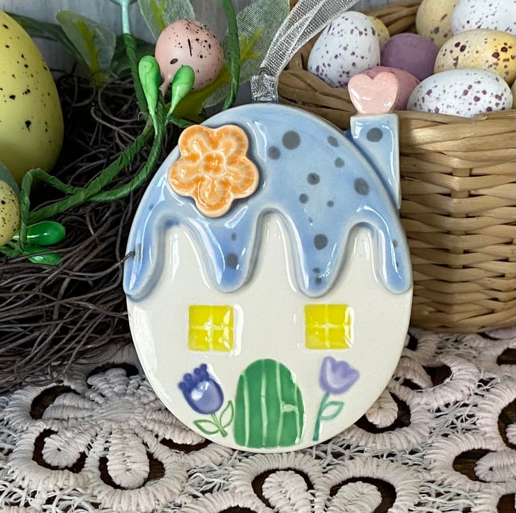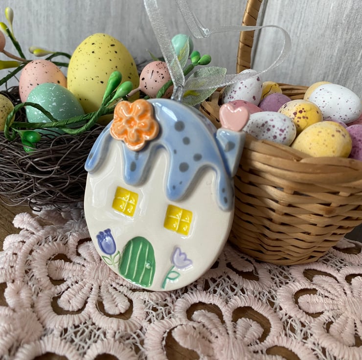 This little ceramic easter egg house is made from white earthenware clay and finished the a flower to the roof and a little pink heart in the chimney. This has been fired in an electric pottery kiln, so it is nice and strong. It measures 7cm x 5cm and hangs from a matching organza ribbon. It is glazed on the front and left plain on the back.
