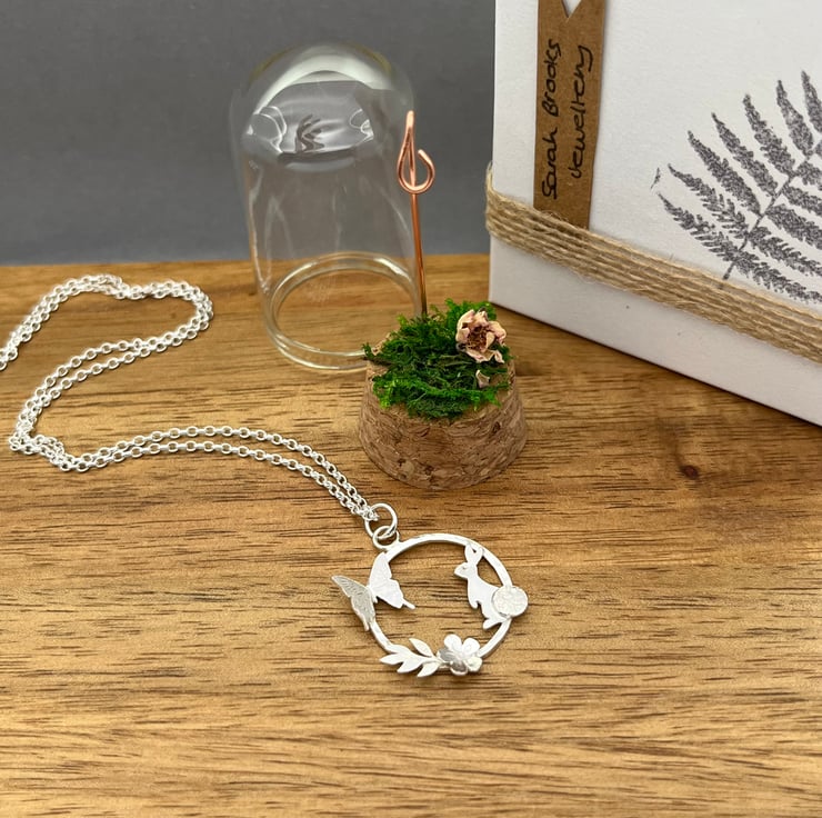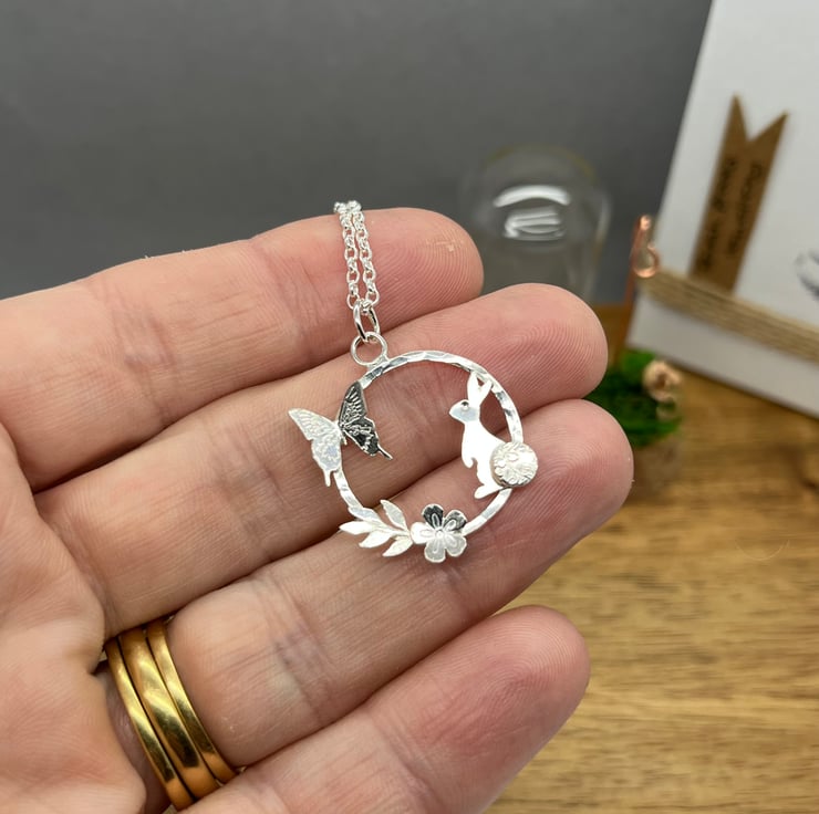 Beautiful handmade pendant featuring a small bunny rabbit, flower, leaf and butterfly. The pendant measures 2.3 cm wide.