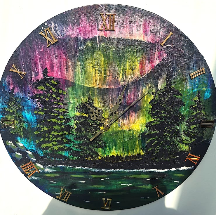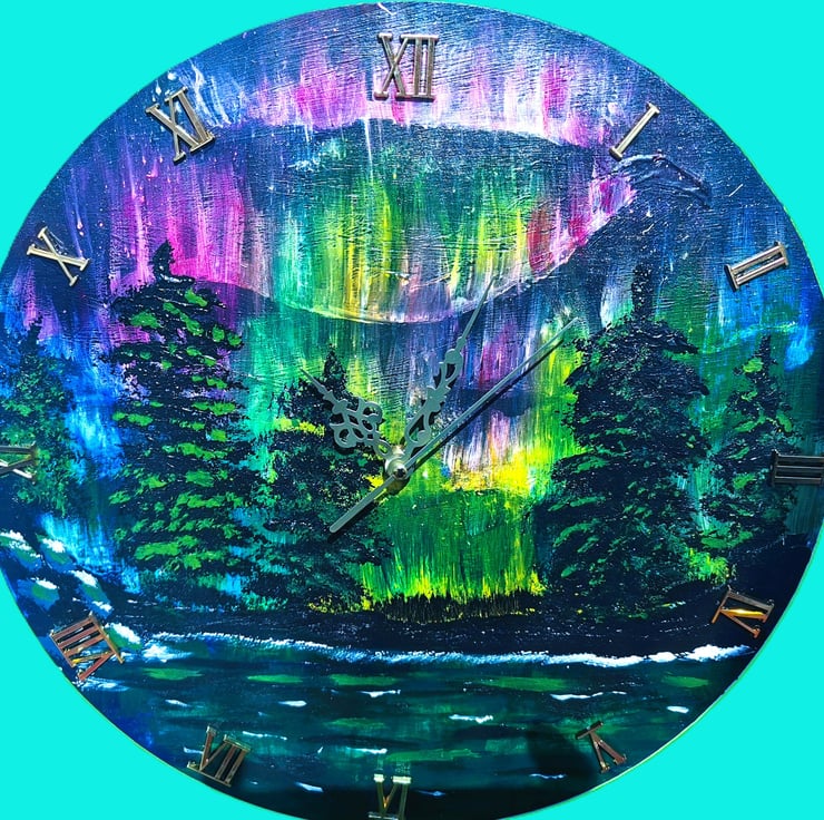 This Large Wall Clock ( Diameter 36cm), depicting the Northern lights would enhance any room! Being made from Jesmonite it is very durable and will give many years of pleasure. It is Battery operated (battery supplied), and Hand Painted in Acrylics. Combining art with functionality.