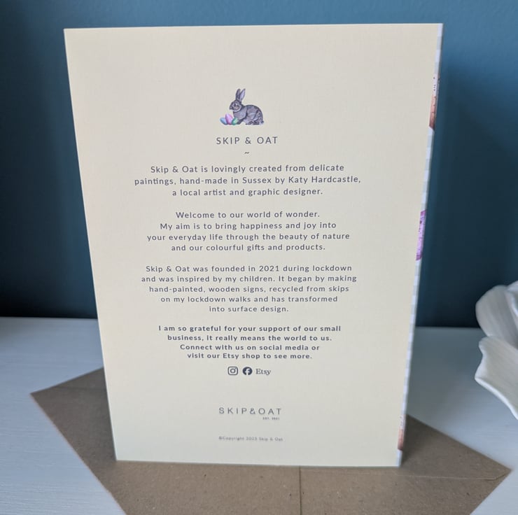 There is a description on the back of the card which gives the story behind my brand, Skip & Oat.