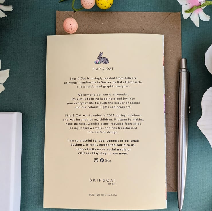 Beautiful Easter A6 greeting card with cute design taken from delicate paintings of rabbits, daffodils, tulips and eggs created by founder of Skip & Oat, Katy Hardcastle. The card also features my watercolour handwriting which gives the card a personal feel.