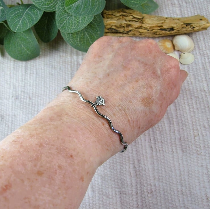 The bracelet is made from 2mm solid sterling silver square wire which I have hand cut, shaped and soldered then hammered into a die to create the wave design. The little anchor was made using molten silver to create a little nugget, that I hammered into a steel die to emboss the little anchor on. Carefully cut out and soldered to the bangle.