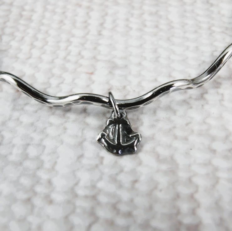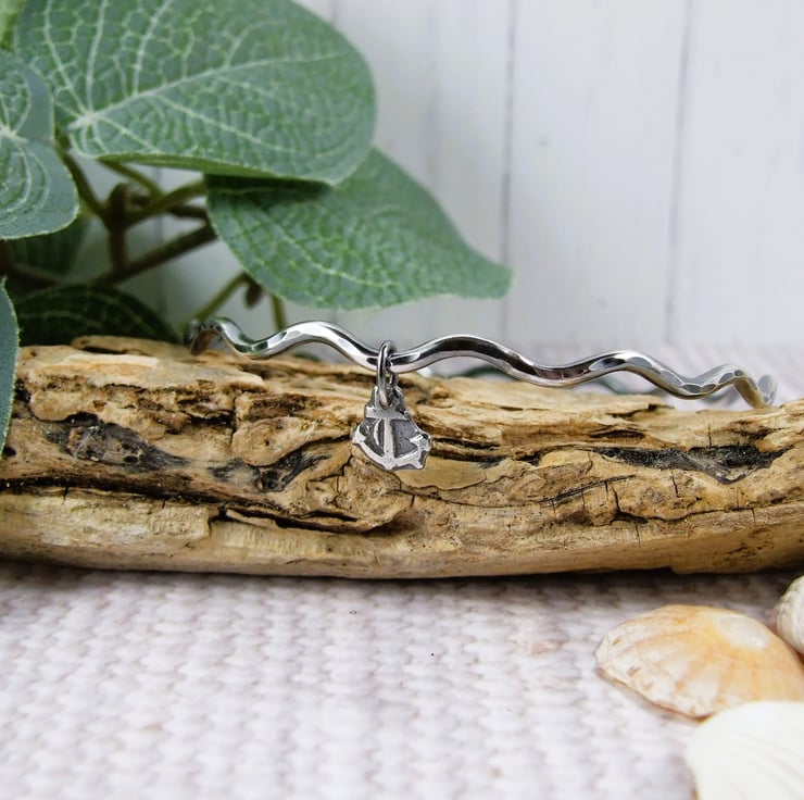 Hand forged Sterling Silver Wave Bangle with Anchor Charm. Size medium 20cm circumference.