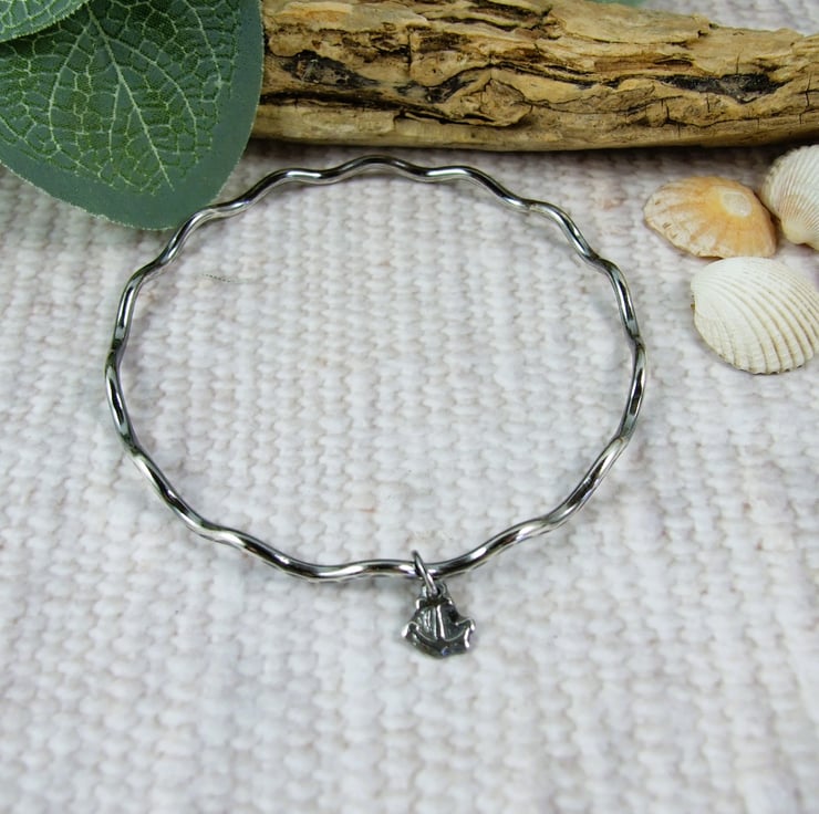 Sterling Silver Wave Bangle with Anchor Charm