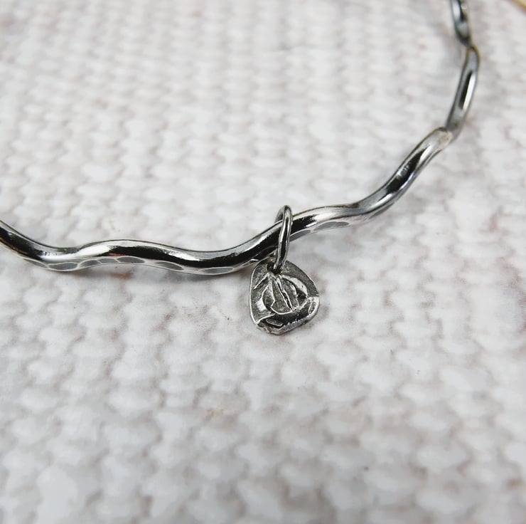 The bracelet is made from 2mm solid sterling silver square wire which I have hand cut, shaped and soldered then hammered into a die to create the wave design. The little sailboat charm was made using molten silver to create a little nugget, that I hammered into a steel die to emboss the little sailboat on. Carefully cut out and soldered to the bangle.