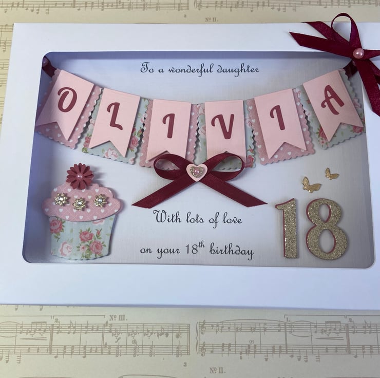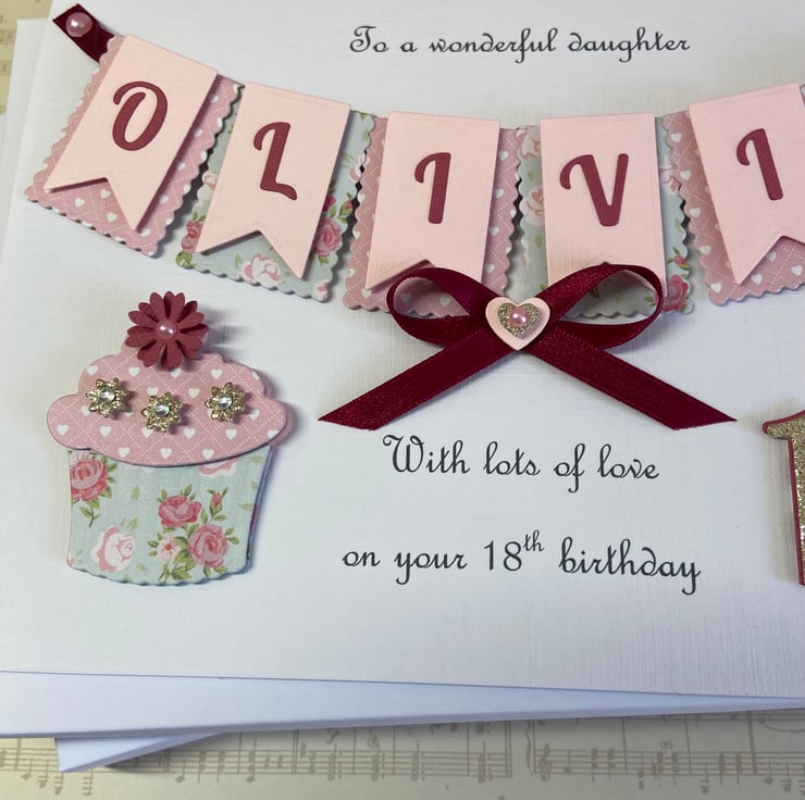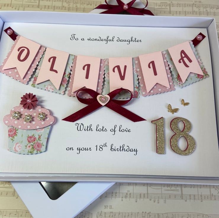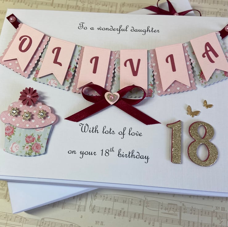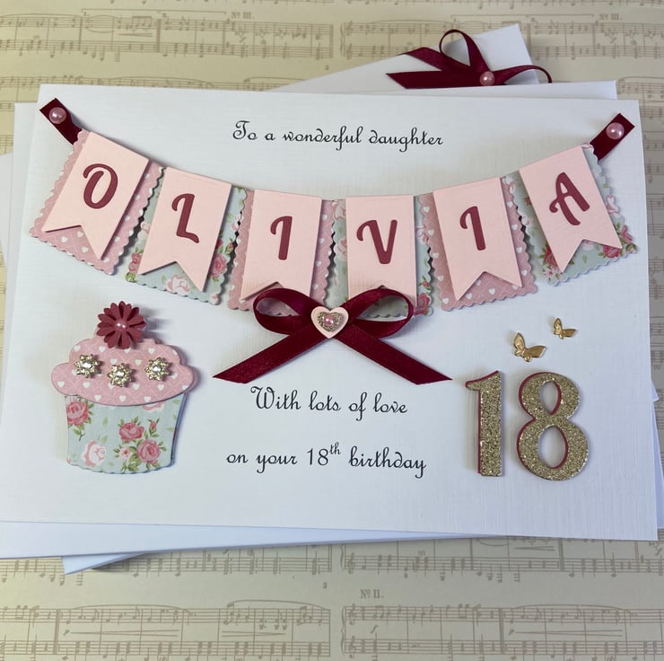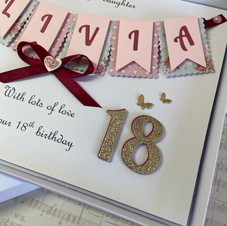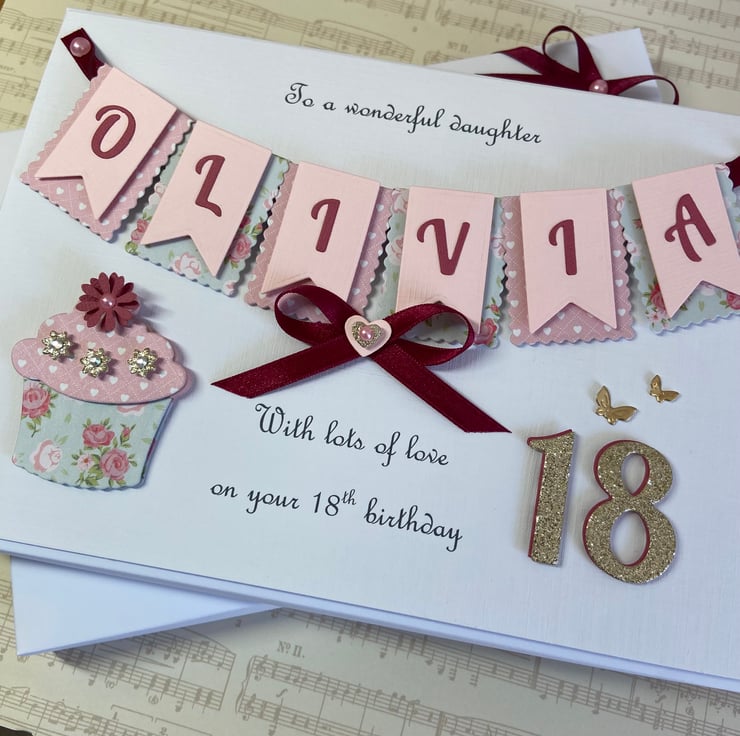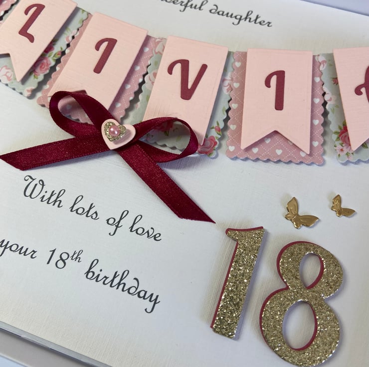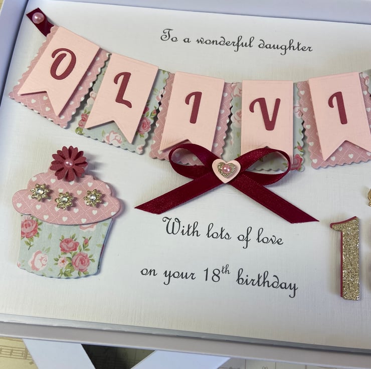 This handmade personalised card is A5 in size ( 210mm x 150mm) and is on 300gsm heavyweight linen cardstock. A name of up to seven letters can be made on the bunting. Any text can be added above and below the bunting. Any age can be put on the card.