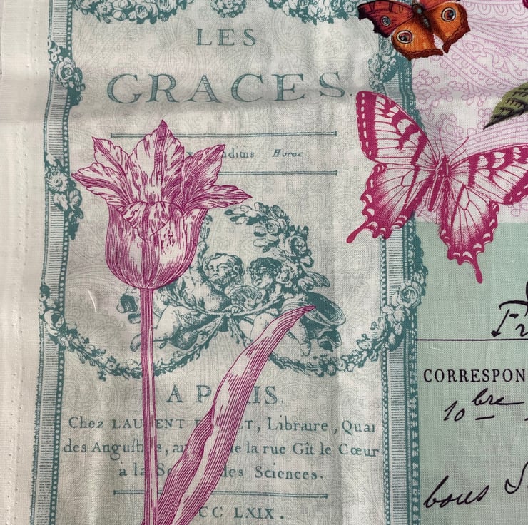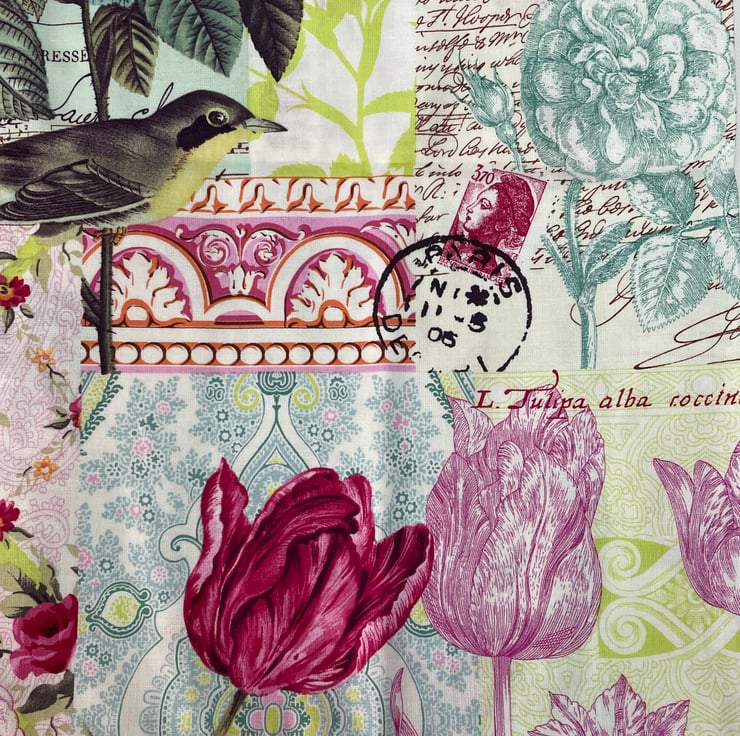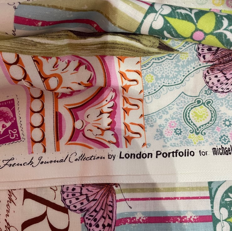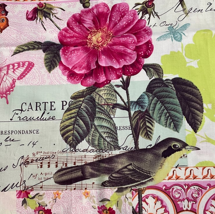 French Journal Collection by London Portfolio for Michael Miller length of cotton fabric. Measures 114cm wide and 1yard length. White background, lots of flowers, French adverts, postcards, birds and more. Perfect for tote bags as a large print area.