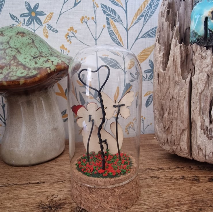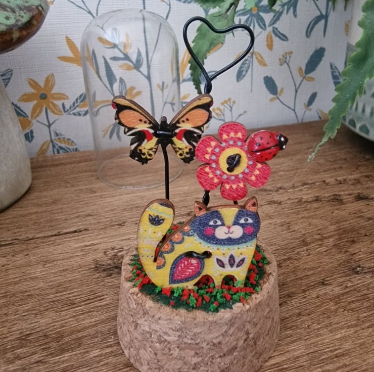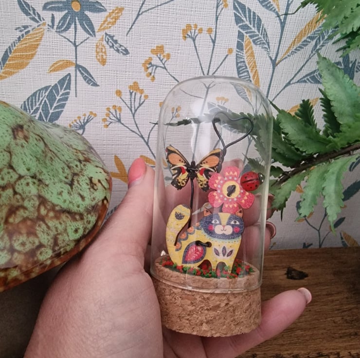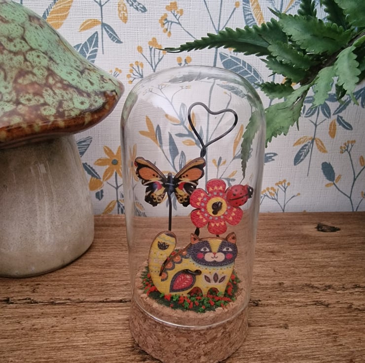 A cute glass dome featuring a pretty cat sitting in his magical garden.