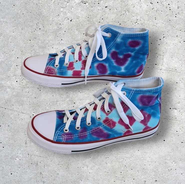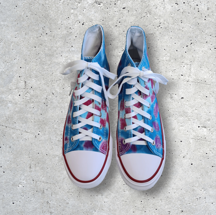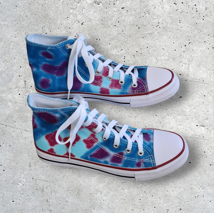 A painted pair of high tops in tie dyed style. Size 41. Treated with waterproofing.