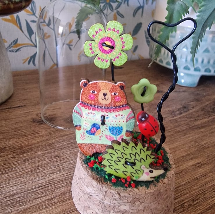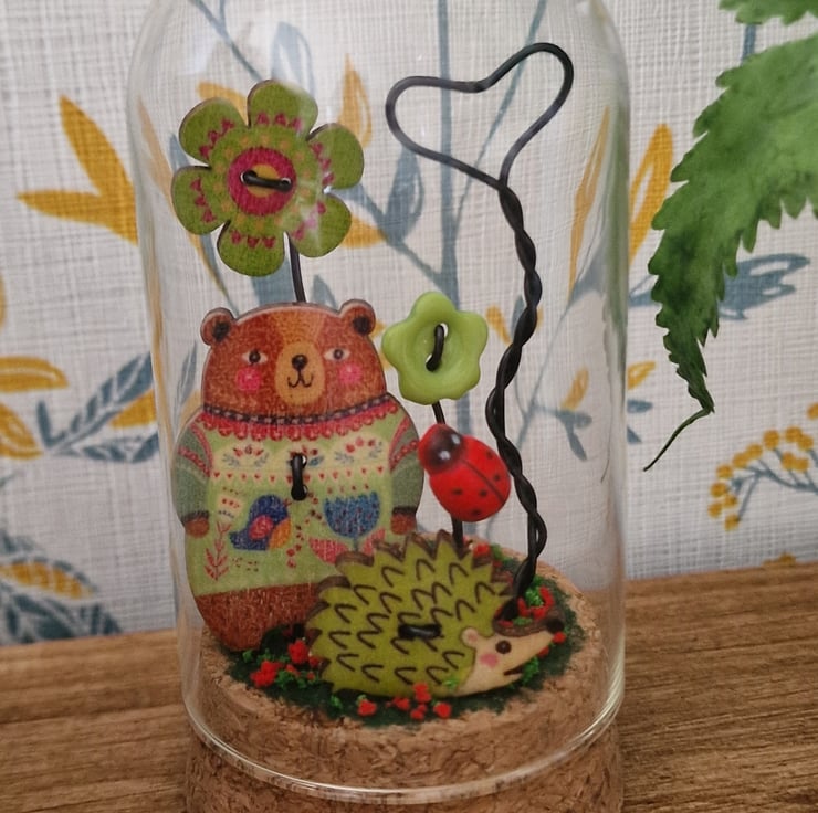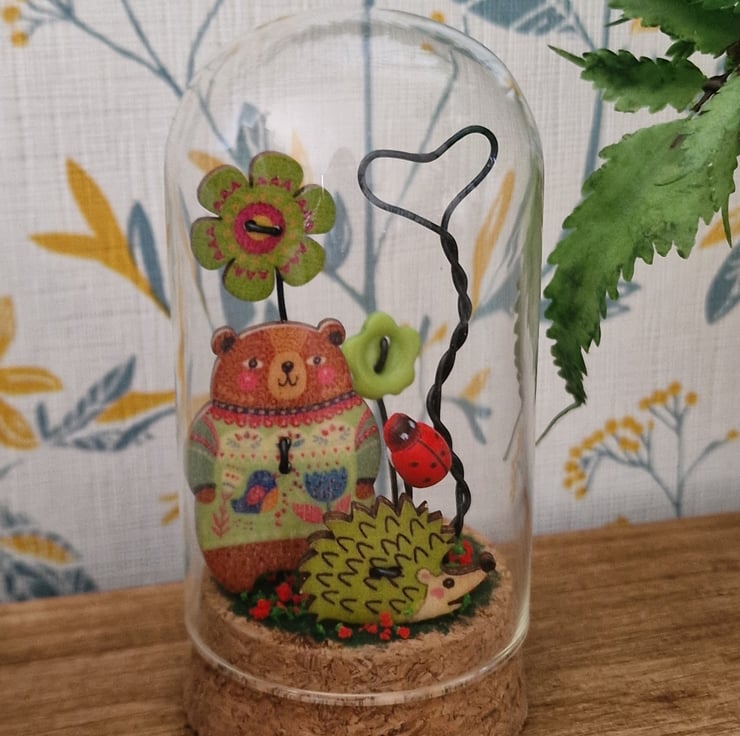 A cute glass dome featuring a handsome bear & a cute hedgehog sitting in their magical garden.