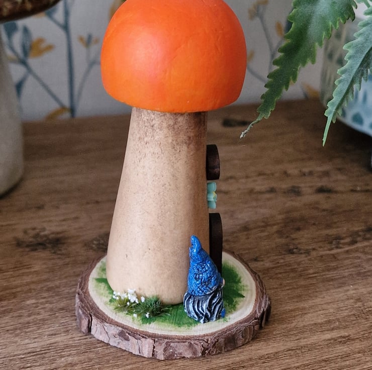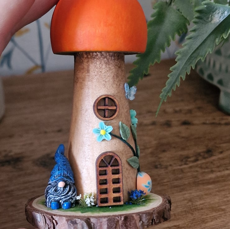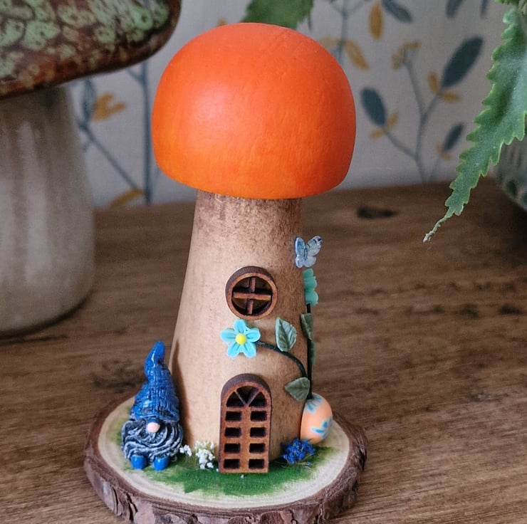 A stunning hand finished wooden mushroom featuring a little tomte gnome sitting in his magical garden.