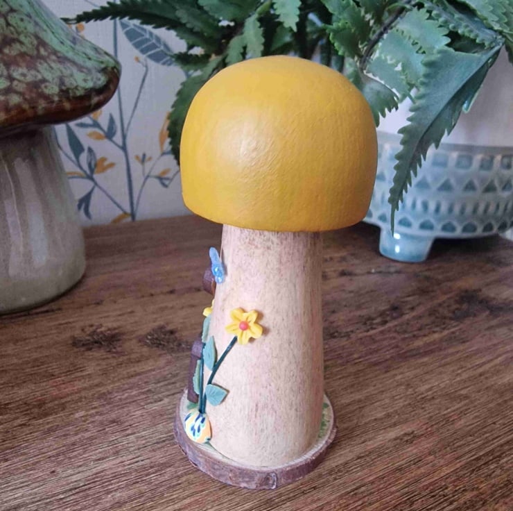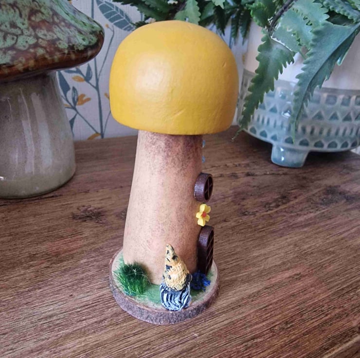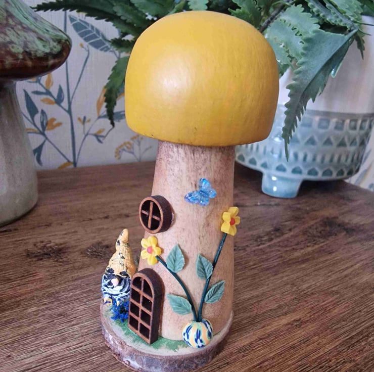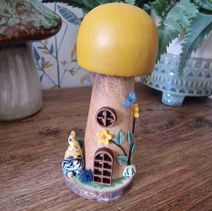 A stunning hand finished wooden mushroom featuring a little tomte gnome sitting in his magical garden.